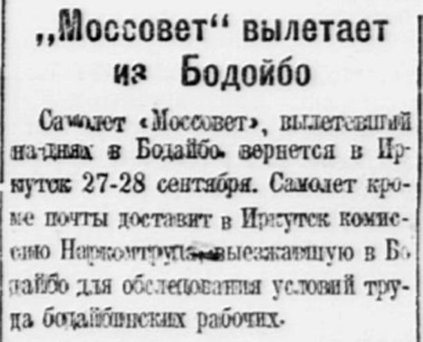Самолет «Моссовет», вылетевший на-днях в Бодайбо, вернется в Иркутск 27-28 сентября. Самолет кроме почты доставит в Иркутск комиссию Наркомтруда, выезжавшую в Бодайбо для обследования условий труда бодайбинских рабочих.
