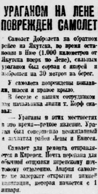 Самолет Добролета на обратном рейсе из Якутска, во время остановки в Нюе (1. 000 километров от Якутска вверх по Лене), сильным ураганом был сорван с якорей и заброшен на 30 метров на берег.
