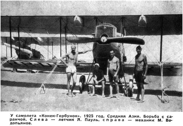 зав.№ 13 Зарегистрирован 29.04.1927 как RR-DEZ. Cредняя азия борьба с саранчой пилот Я.Г.Пауль, механик М.В.Водопьянов фото Шелест) 19-6-1934 А весной 1929 года Водопьянова назначили в экспедицию по борьбе с саранчой.Отряд наш состоял из двух самолетов, и так как я имел опыт по борьбе с саранчой, меня назначили начальником этого отряда. Мы должны были поездом перевезти самолеты в Краснодар, там собрать их и перелететь на место работы в станицу Петровскую. Самолеты у нас были „Коньки-Горбунки"; мне дали тот самый самолет № 13, который мы с летчиком Паулем чуть не сожгли. В 1928 получил обозначение ДЛ-13. С 04.06.1929 СССР-103. Списан в октябре 1929.