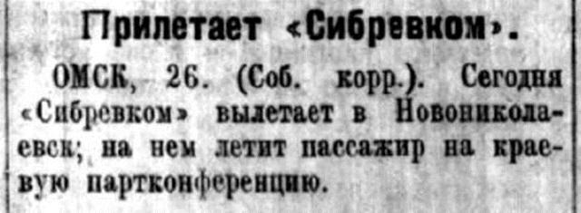 ОМСК, 26. (Соб. корр.). Сегодня «Сибревком» вылетает в Новониколаевск; на нем летит пассажир на краевую партконференцию.