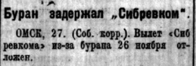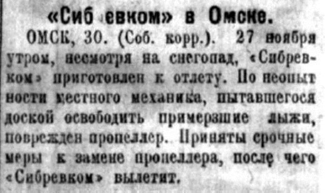ОМСК, 25. (Соб. корр.). При 25 градусном морозе "Сибревком" вылетел из Тары в Омск. Не долетая до Омска, из-за поломки части мотора, "Сибревком" вынужден был опуститься в урмане. Исправив поломку, «Сибревком» прибыл 25 ноября в Омск.