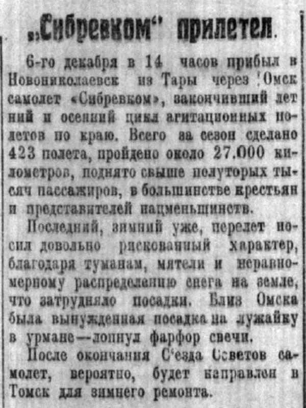 6-го декабря в 14 часов прибыл в Новониколаевск из Тары через Омск самолет «Сибревком», закончивший летний и осенний цикл агитационных полетов по краю. Всего за сезон сделано 423 полета, пройдено около 27.000 километров, поднято свыше полуторых тысяч пассажиров, в большинстве крестьян и представителей нацменьшинств.
