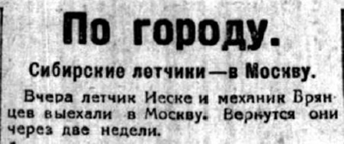 Вчера летчик Иеске и механик Брянцев выехали в Москву. Вернутся они через две недели.