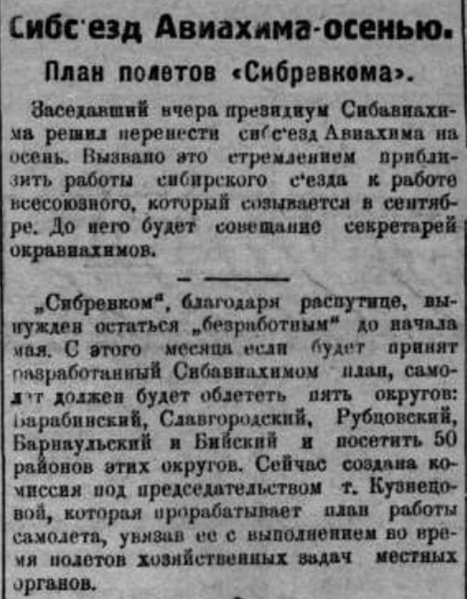 Сибосоавиахим стремится все же провести в этом году агитполеты по Иркутскому округу, где "Сибревком" не бывал ни разу. Ввиду запоздании с прилетом самолета из Иркутска "Сибревком" после ремонта в мастерских об-ва Добролет отправится прямо в Бодайбо. Предполагавшиеся ранее круговые агитполеты с пассажирами в Братске, Усть-Уде и др. пунктах на Ангаре, будут проведены после возвращения самолета с Лены. После этого "Сибревком" будет поставлен на колеса и может летать по округу, обслуживая рабочие районы (Черемхово. Хайту и другие). вплоть до осени.