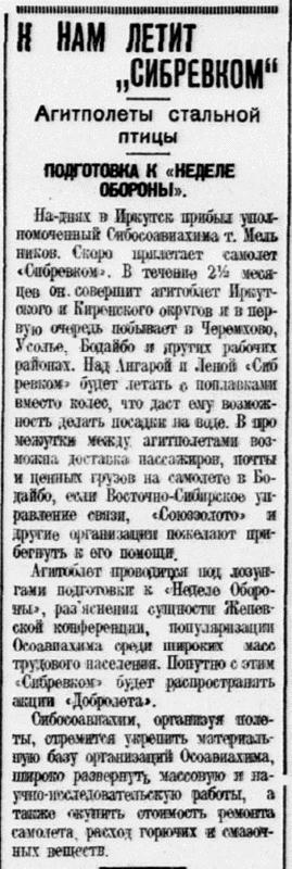 На-днях в Иркутск прибыл уполномоченный Сибосоавиахима т. Мельников. Скоро прилетает самолет "Сибревком". В течение 2 1/2 месяцев он совершит агитоблет Иркутского и Киренского округов и в первую очередь побывает в Черемхово, Усолье, Бодайбо и других рабочих районах. Над Ангарой и Леной "Сибревком" будет летать с поплавками вместо колес, что даст ему возможность делать посадки на воде. В промежутки между агитполетами возможна доставка пассажиров, почты и ценных грузов на самолете в Бодайбо, если Восточно-Сибирское управление связи, "Союззолото" и другие организации пожелают прибегнуть к его помощи.