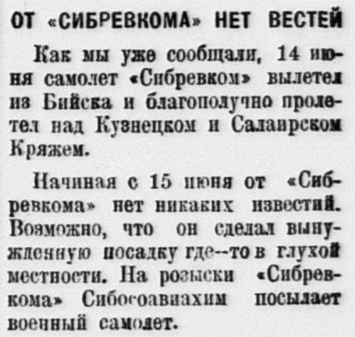 Начиная с 15 июня от «Сибревкома» нет никаких известий. Возможно, что он сделал вынужденную посадку где-то в глухой местности. На розыски «Сибревкома» Сибосоавиахим посылает военный самолет.