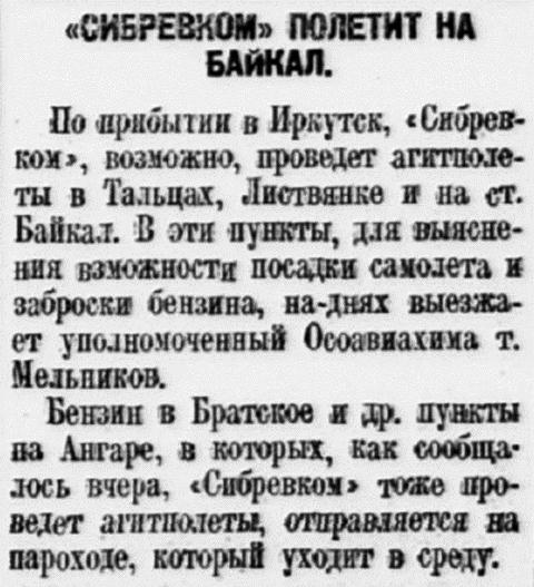 По прибытии в Иркутск, «Сибревком», возможно, проведет агитполеты в Тальцах, Листвянке и на ст. Байкал. В эти пункты, для выяснения возможности посадки самолета и заброски бензина, на-днях выезжает уполномоченный Осоавиахима т. Мельников.