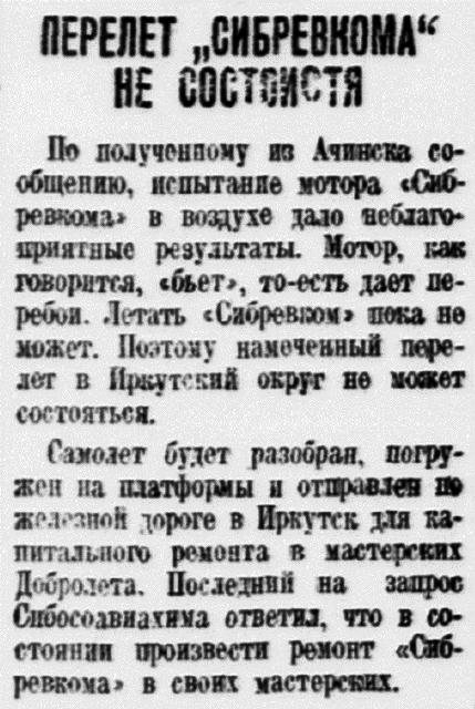 По полученному из Ачинска сообщению, испытание мотора "Сибревкома" в воздухе дало неблагоприятные результаты. Мотор, как говорится, "бьет", то-есть дает перебои. Летать "Сибревком" пока не может. Поэтому намеченный перелет в Иркутский округ не может состояться.