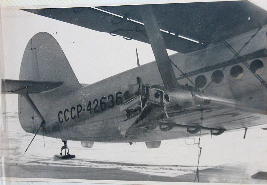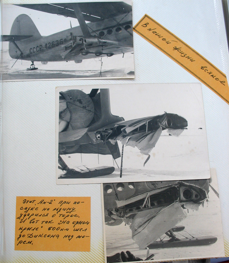 На Диксоне села наша АН-2 буквально- на одном крыле. Услышав об этом, я схватил фотоаппарат и рванул на стоянку. Представьте себе: стоит самолет без правого нижнего крыла, напрочь отбитого по стойку, в таком виде только что пролетевший 450 километров со льдины! Оказывается при посадке на льдину он зацепил правым крылом за торос и отбил его. Связались с Диксоном, говорят - ждите помощи. А сколько ждать? А прогноз погоды паршивый!.Стали думать - что делать. Льдина длинная, давай сделаем подлет: будет машина держаться, или нет?