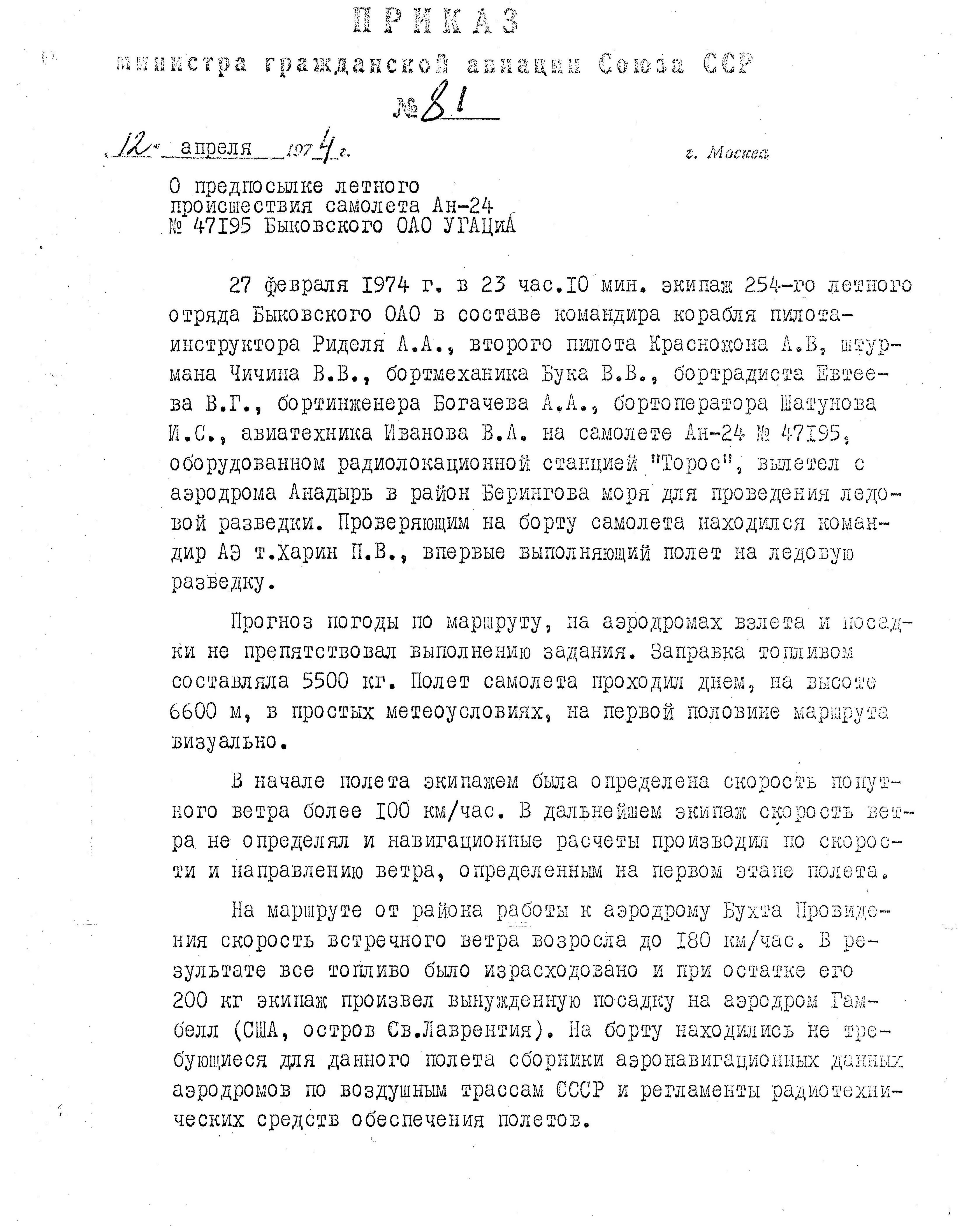 Приказ Министра ГА СССР № 81 от 12.04.74 г. "О предпосылке летного происшествия самолета Ан-24 № 47195 Быковского ОАО УГАЦиА.