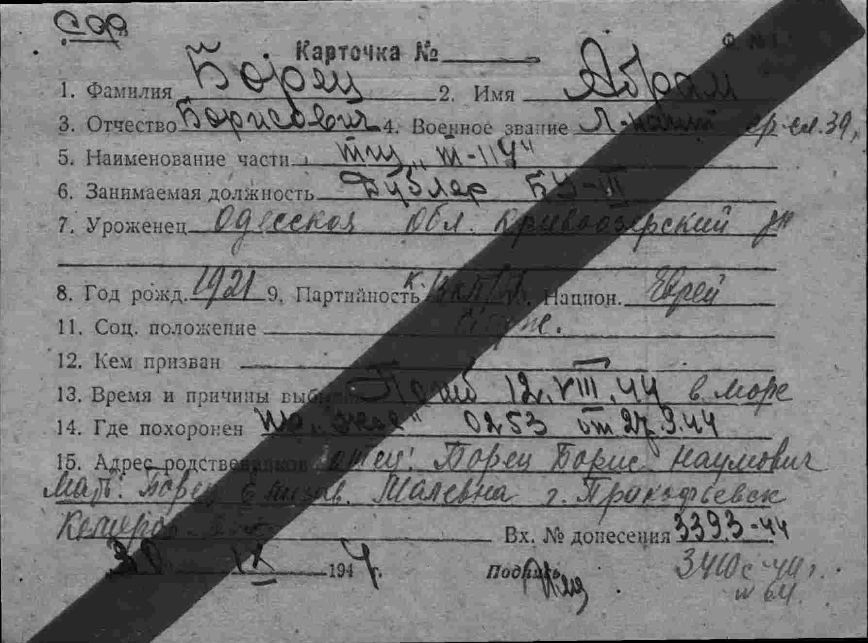 Донесение о безвозвратных потерях 17471 от 02.10.1944 (ЦВМА, Ф. 3, О. 1, Д. 402).