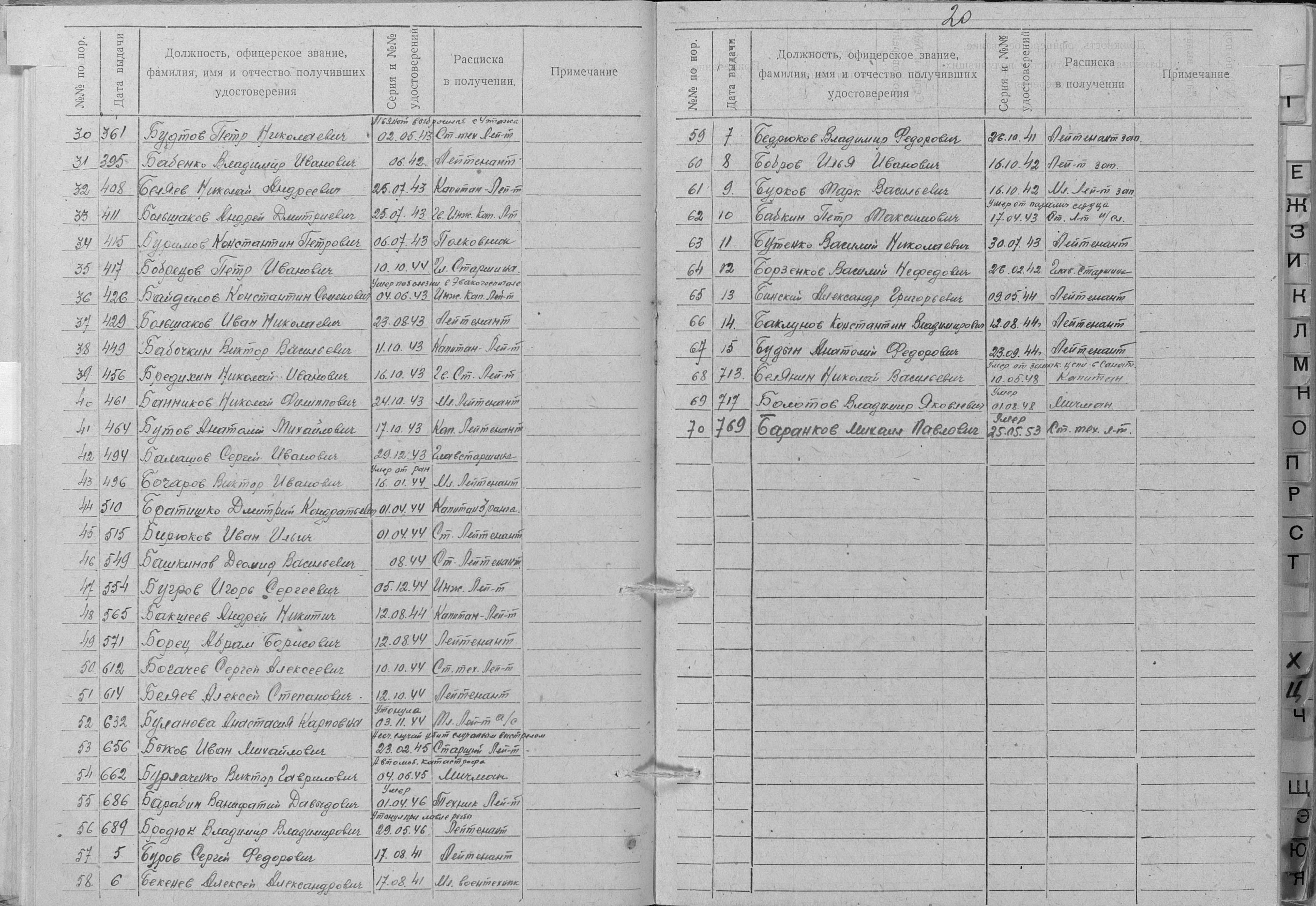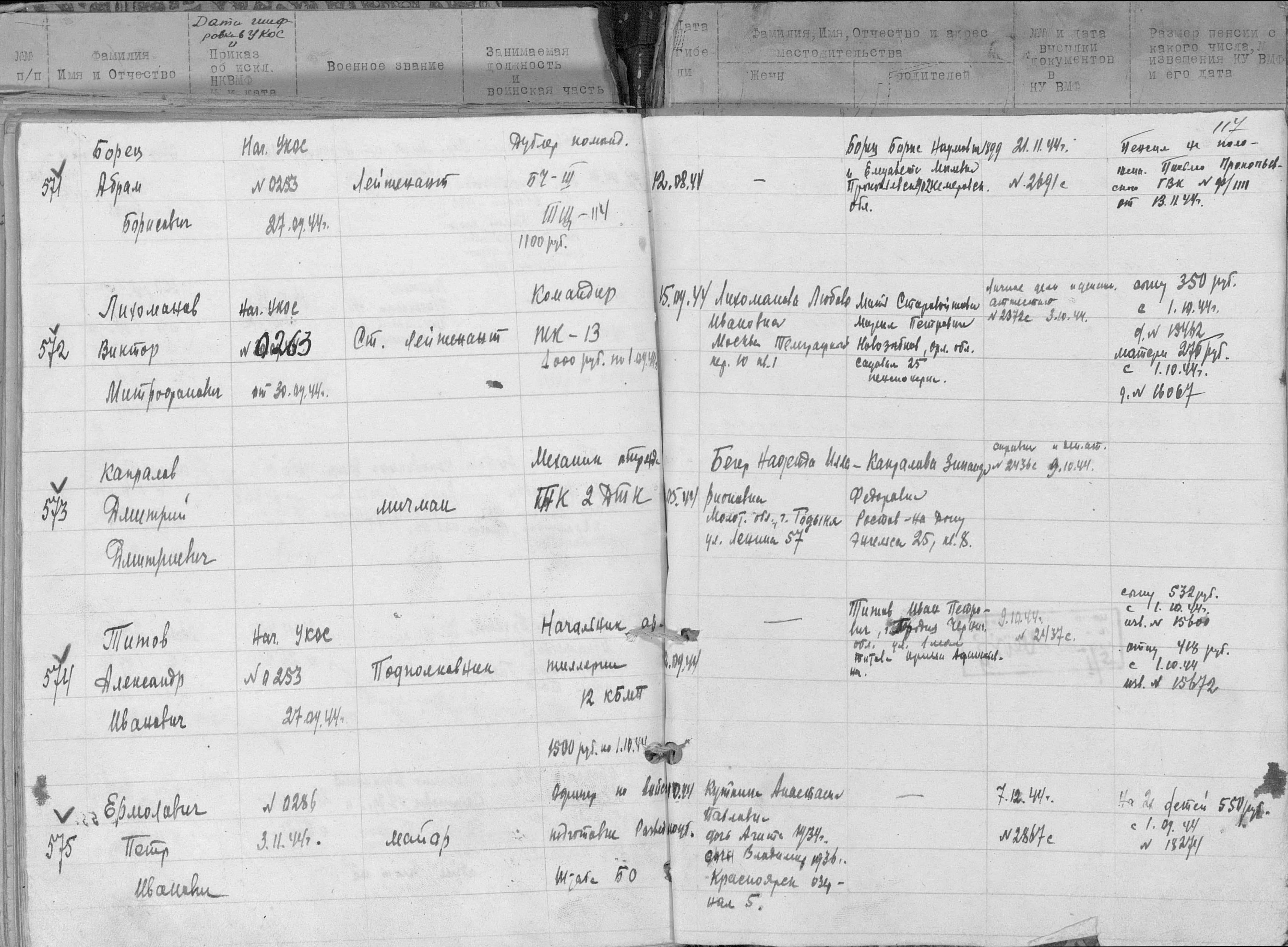 Книга учета безвозвратных потерь начсостава за Отечественную войну Командный отдел СФ (ЦВМА, Ф. 691, О. 1, Д. 4).