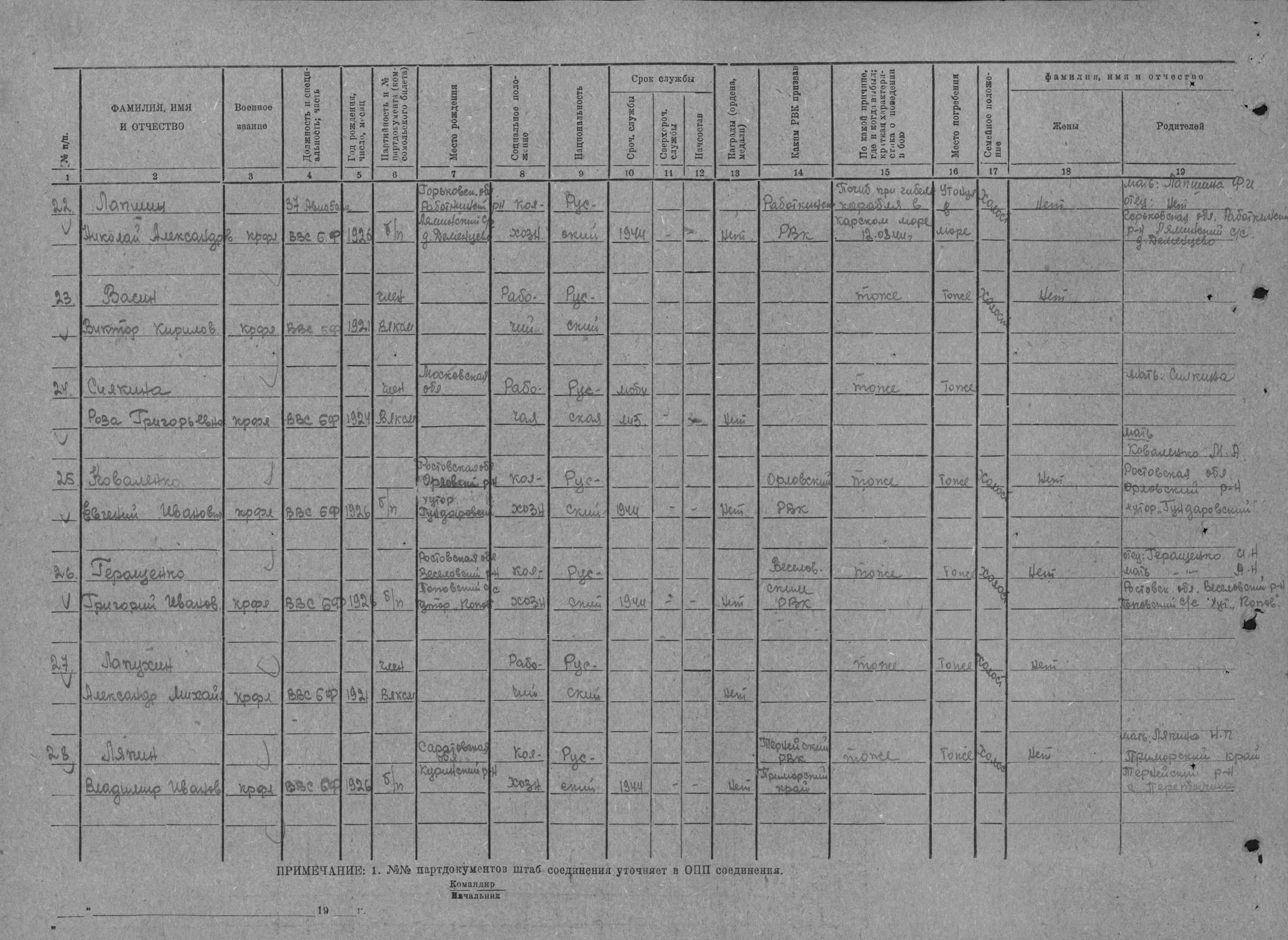 Донесение о безвозвратных потерях 3232 от 19.09.1944 (ЦВМА, Ф. 864, О. 1, Д. 1342).