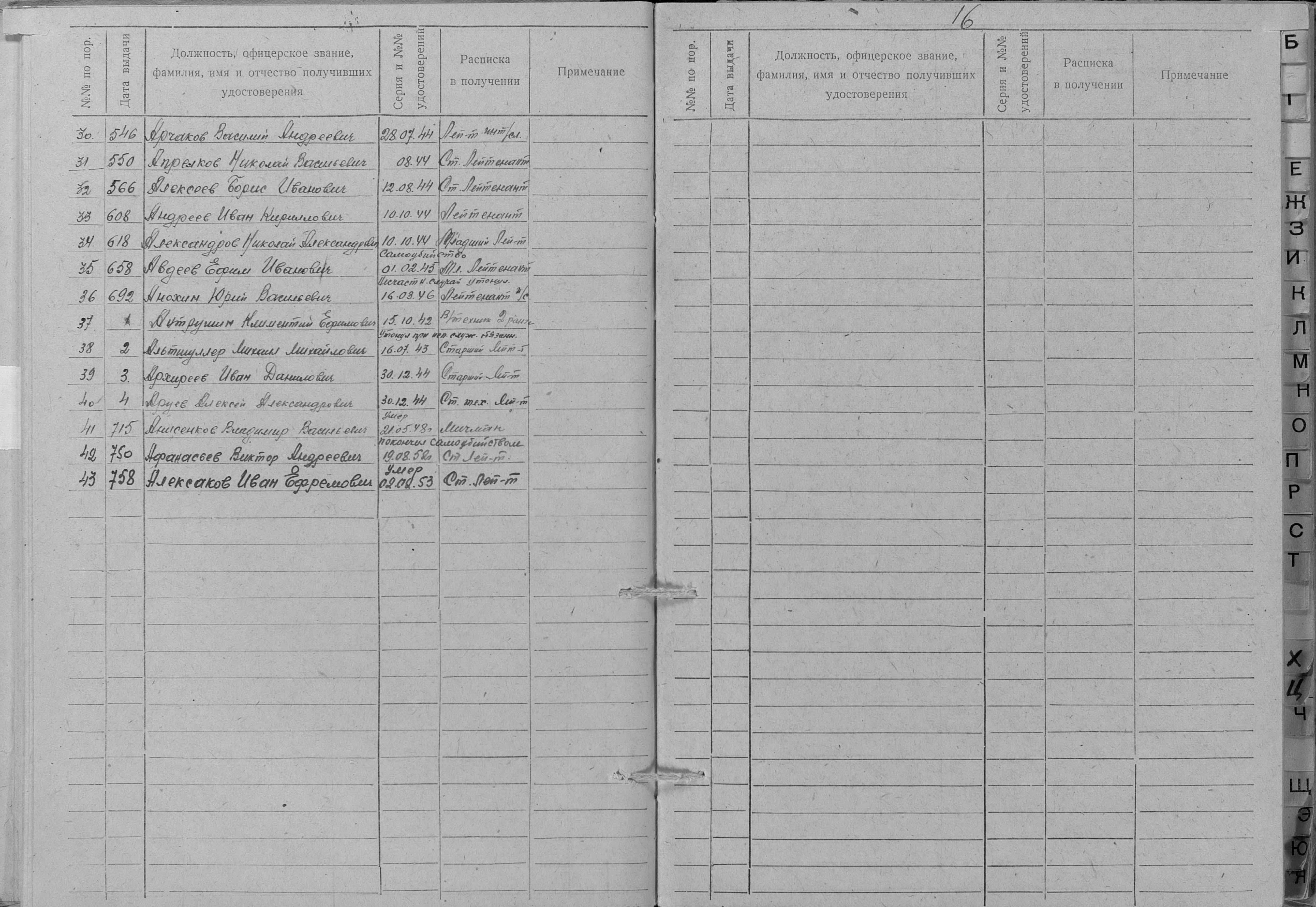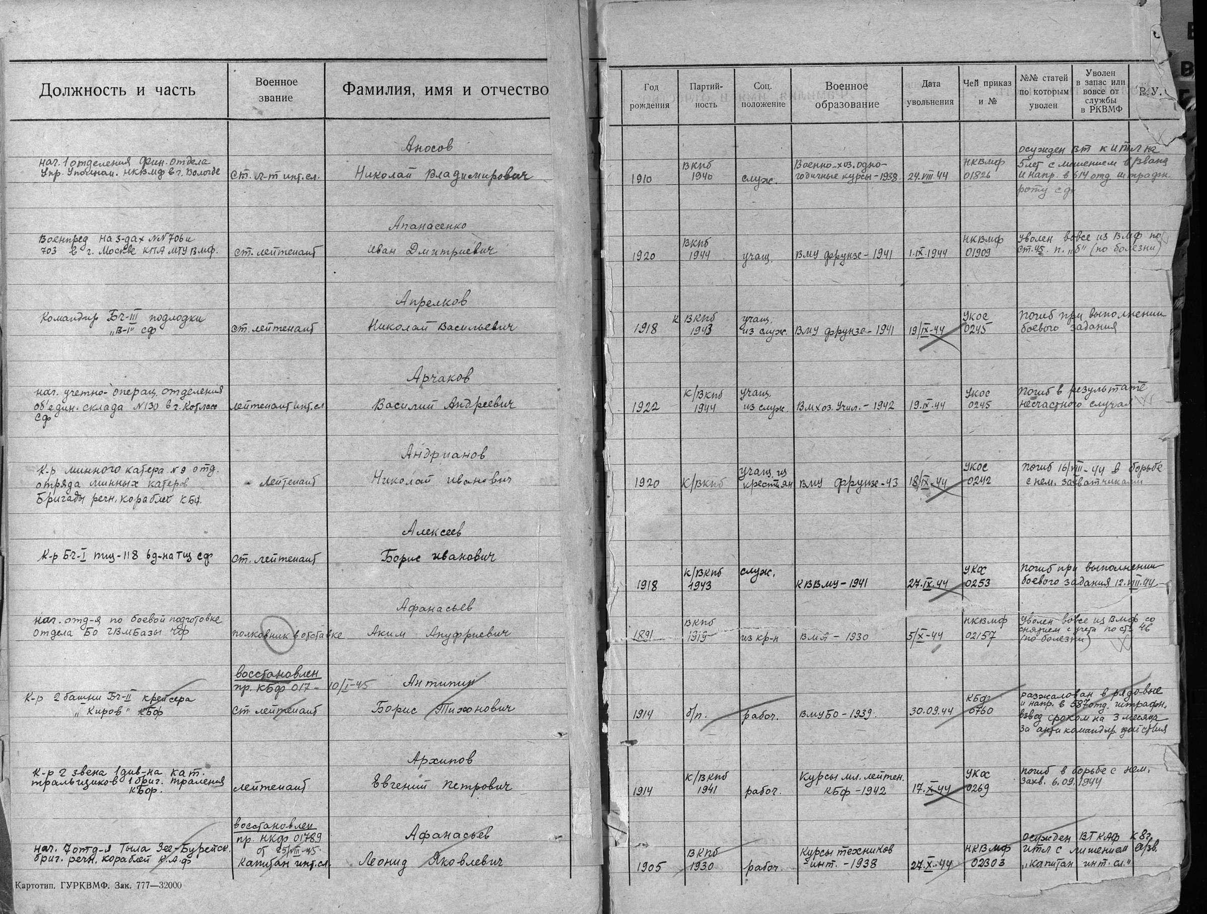 Книга учета безвозвратных потерь начсостава за Отечественную войну Командный отдел СФ (ЦВМА, Ф. 691, О. 1, Д. 4).