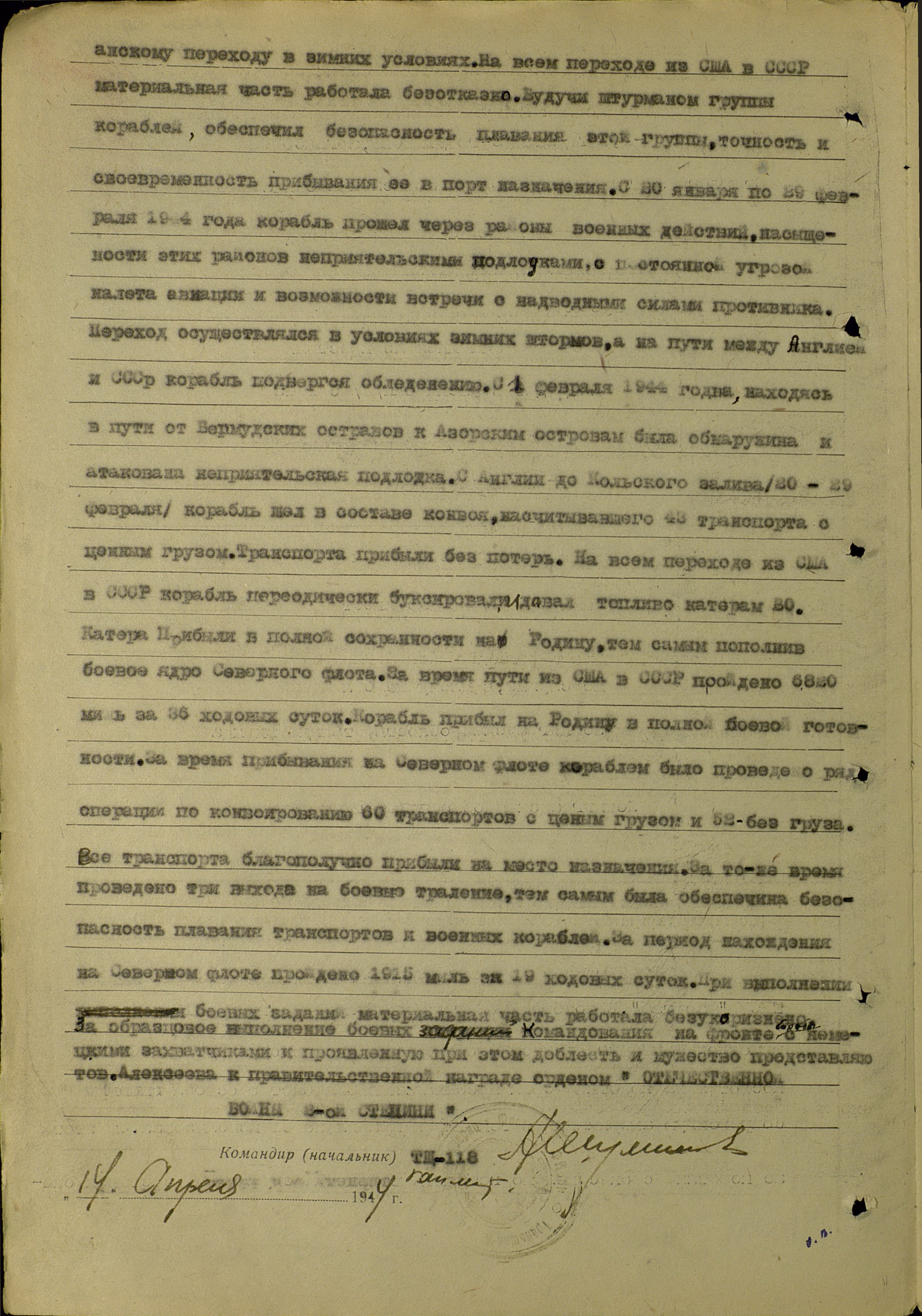С апреля 1943 года служил на Северном флоте на ГИСУ «Масштаб». В ноябре 1943 г. прибыл в США на ТЩ-118 для выполнения правительственного задания по переводу корабля из США в СССР. Несмотря на короткий срок пребывания в США, быстро освоил современную американскую технику и правильно ее использовал. За этот же короткий срок сумел подготовить вверенный ему личный состав к океанскому переходу в зимних условиях. На всем переходе из США в СССР материальная часть работало безотказно. Будучи штурманом группы кораблей, обеспечил безопасность плавания этой группы, точность и своевременность пребывания ее в порт назначения. С 20 января по 29 февраля 1944 г. корабль прошел через районы военных действий, насыщенности (?) этих районов неприятельскими подлодками с постоянной угрозой налета авиации и возможности встречи с наводными силами противника. Переход осуществлялся в условиях зимних штормов, а на пути между Англией и СССР корабль подвергся обледенению. С 1 февраля 1944 г. (?), находясь в пути от Бермудских островов к Азорским островам, была обнаружена и атакована неприятельская подлодка. С Англии до Кольского залива (20–29 февраля) корабль шел в составе конвоя, насчитывавшего 43 транспорта с ценным грузом. Транспорты прибыли без потерь. На всем переходе из США в СССР корабль периодически буксировал и давал топливо катерам БО. Катера прибыли в полной сохранности на Родину, тем самым пополнив боевое ядро СФ. За время пути из США в СССР пройдено 6820 миль за 36 ходовых суток. Корабль прибыл на Родину в полной боевой готовности. За время пребывания на СФ кораблем было проведен ряд операций по конвоированию 60 транспортов с ценным грузом и 52 – без груза. Все транспорты благополучно прибыли на место назначении. За то же время проведены три выхода на боевые траления, тем самым была обеспечена безопасность плавания транспортов и военных кораблей. За период нахождения на СФ пройдено 1915 миль за 19 ходовых суток. При выполнении боевых заданий материальная часть работала безукоризненно