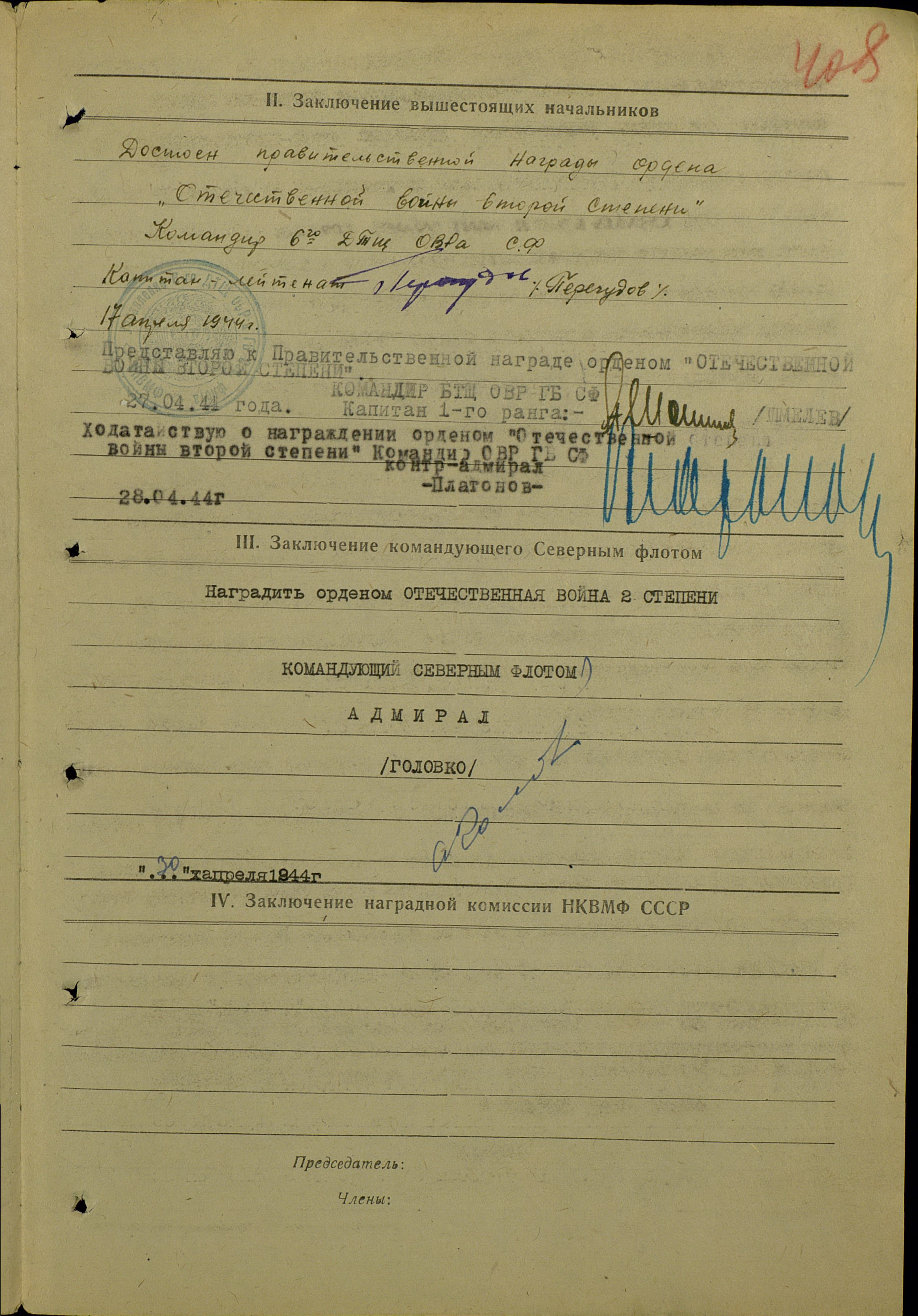 За образцовое выполнение боевых заданий командования на фронте борьбы с немецкими захватчиками и проявленную при этом доблесть и мужество представляю тов. Алексеева к правительственной награде – ордену «Отечественной воины 2 степени».