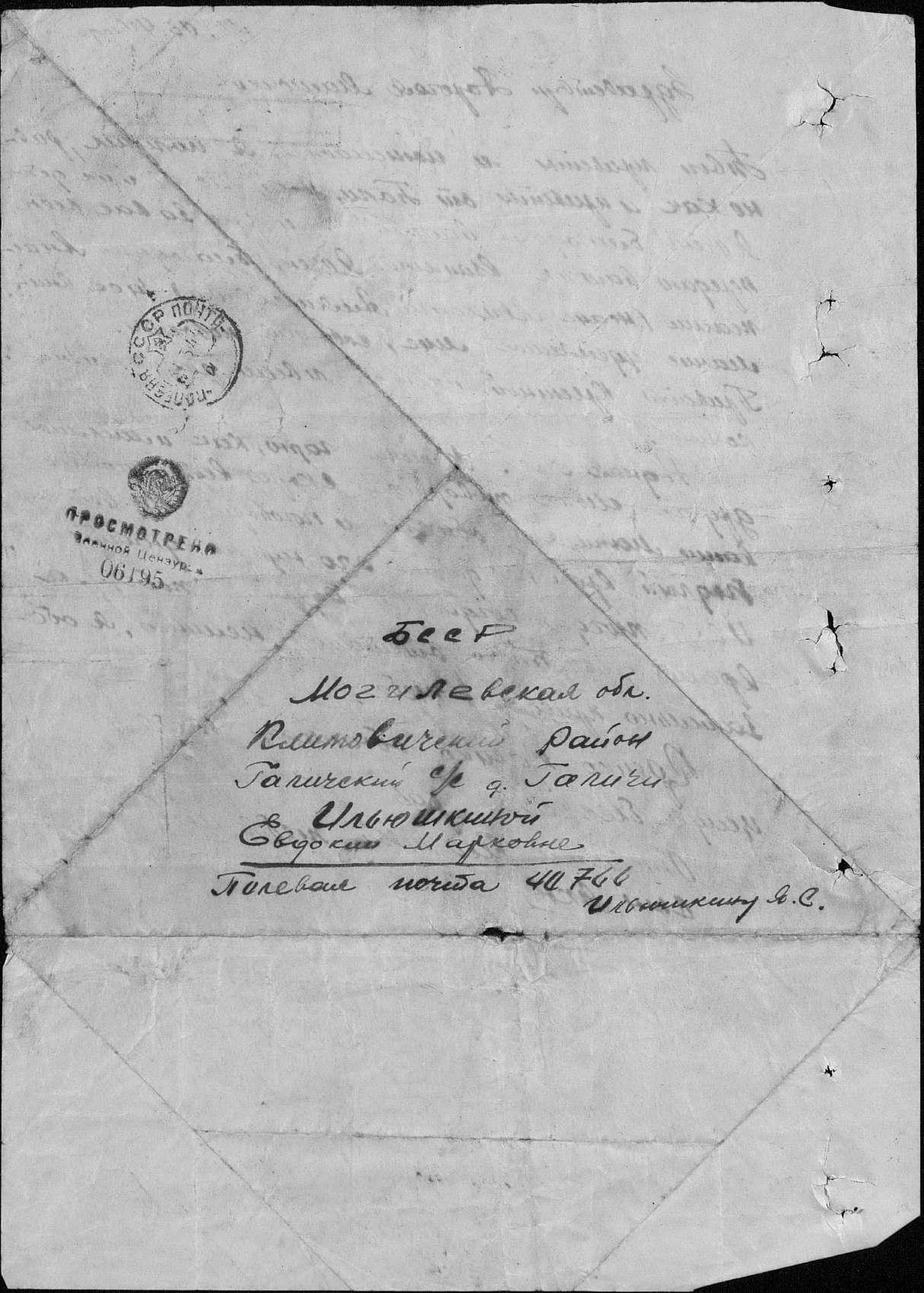 80. Ильюшкин Яков Савельевич, дата рождения – 1917 г.; место рождения – Белорусская ССР, Могилевская обл., Климовичский р-н, Галичский с/с, д. Галичи; дата и место призыва – 1938 г., Фрунзенский РВК, Московская обл., г. Москва, Фрунзенский р-н; последнее место службы – п/п 40766; воинское звание – рядовой; причина выбытия – пропал без вести; дата выбытия – не ранее 29.03.1944; родственники – мама - Ильюшкина Евдокия Марковна; где проживают родственники (подробный адрес) – Могилевская обл., Климовичский р-н, Галичский с/с, д. Галичи; архив – ЦАМО; номер фонда – 58; номер описи – 977522; номер дела – 90.