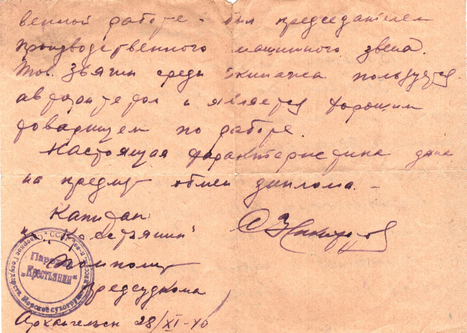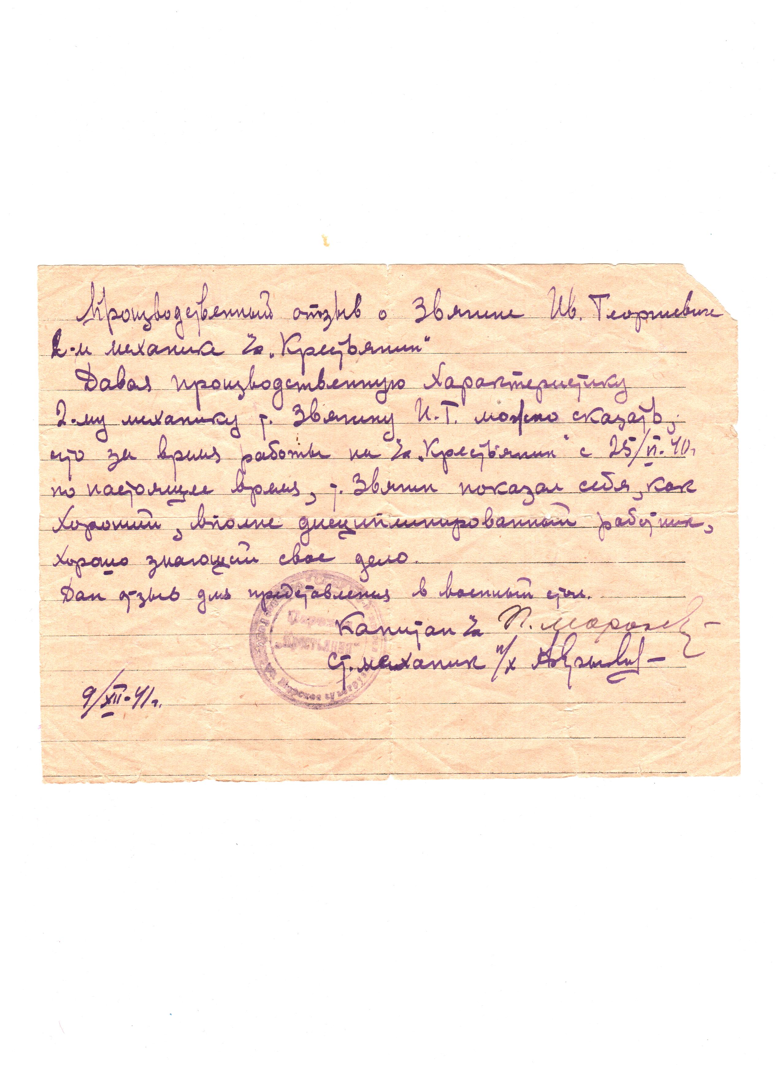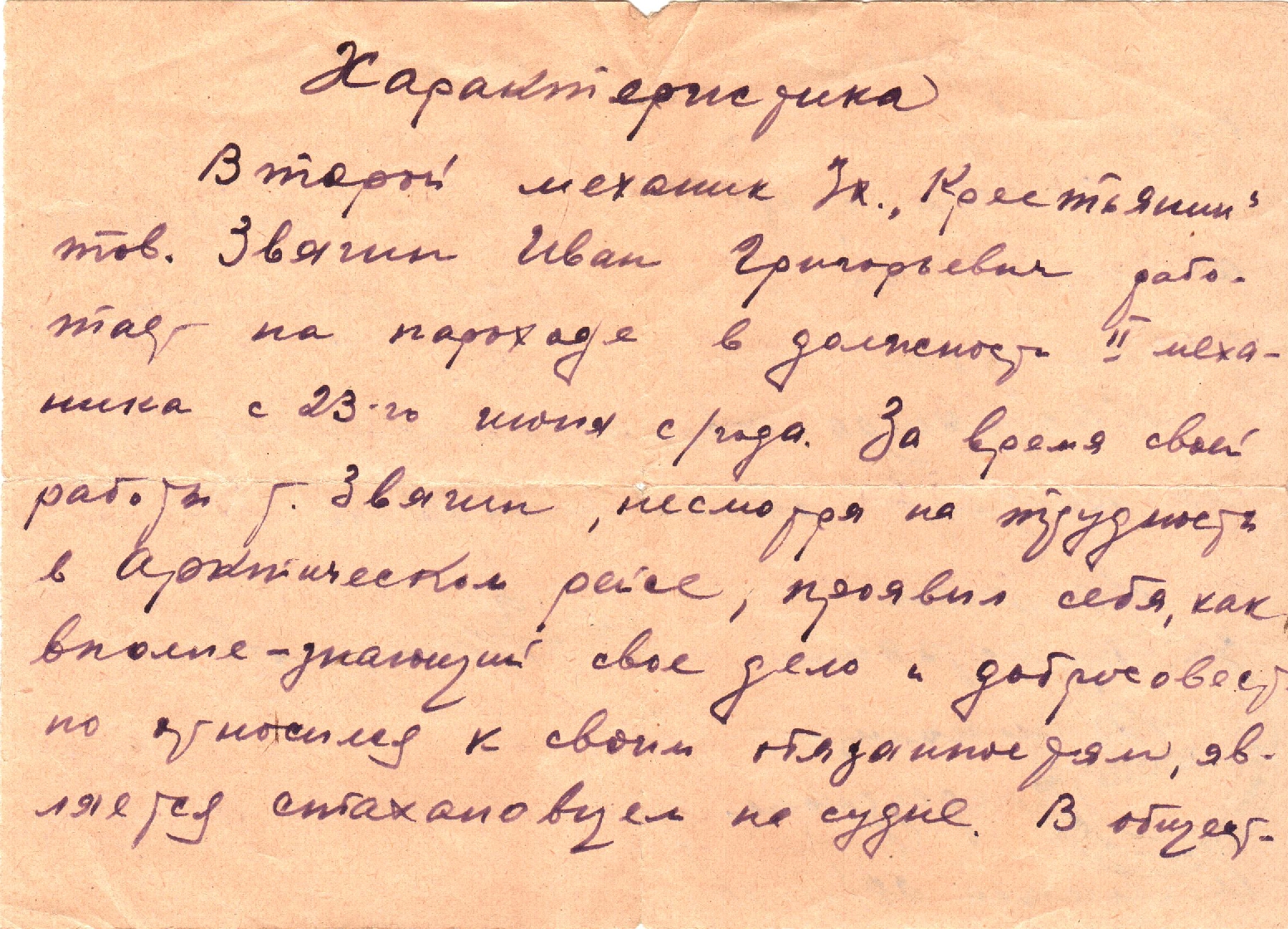 Давая производственную характеристику 2-му механику т. Звягину И.Г. можно сказать, что за время работы на п/х «Крестьянин» с 25/VI-40 г. по настоящее время, т. Звягин показал себя, как хороший, вполне дисциплинированный работник, хорошо знающий свое дело.