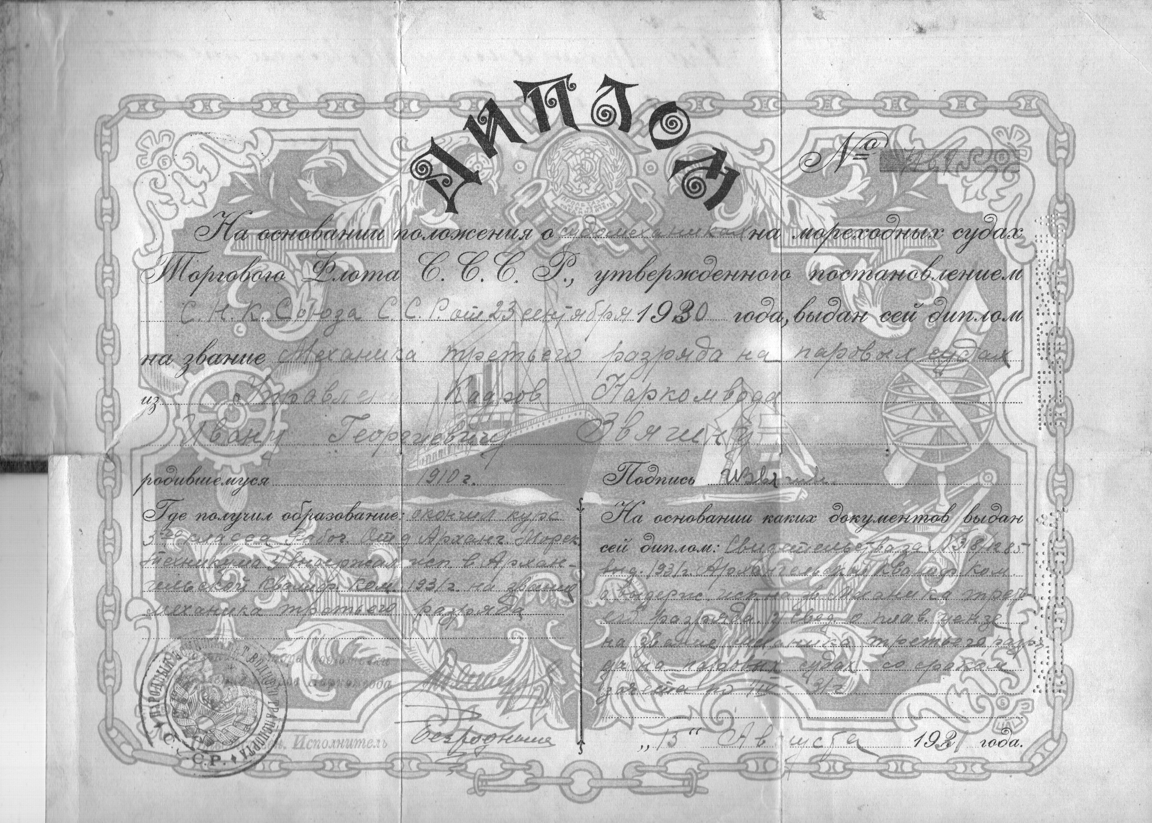 С 1934 года по 1936 года работал на … механическом заводе в должности техника-нормировщика, т.к. необходимо было иметь производственную практику для получения диплома на механика 2-го разряда, получив необходимый стаж на производстве, я пошел плавать.