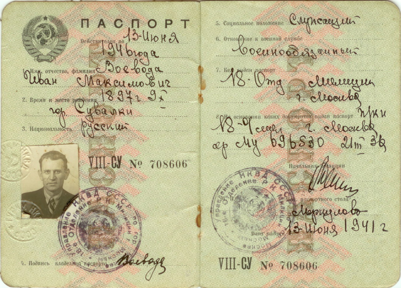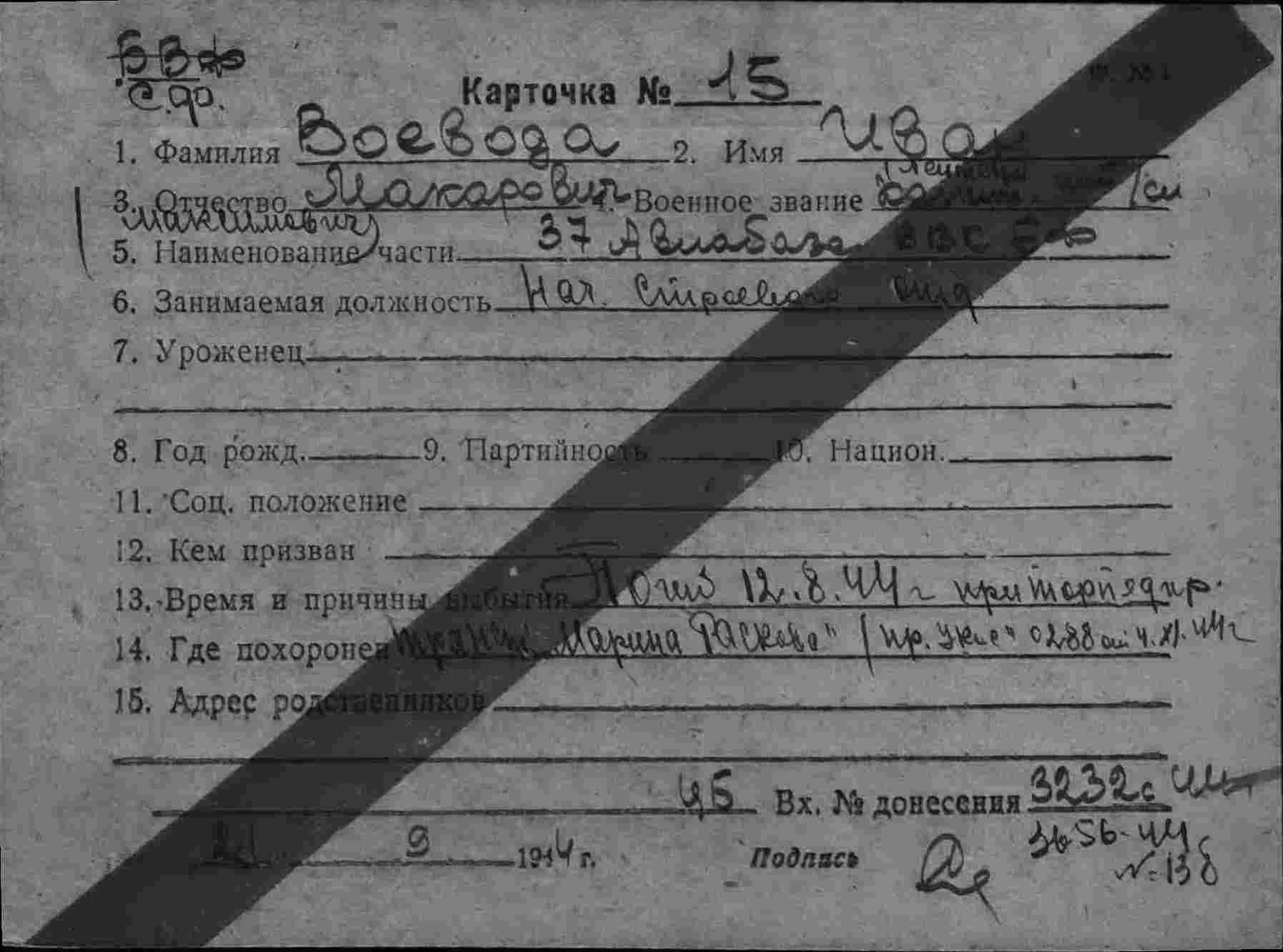 107. Воевода Иван Максимович, пассажир транспорта «Марина Раскова», воинское звание – капитан интендантской службы; должность и специальность – начальник строевой части (строевого отделения) 37 авиабазы ВВС СФ; дата рождения – 09.10.1897 г.; партийность и № партдокумента (комсомольского билета) – член ВКП (б) с 1917 г., 0009020; место рождения – г. Сувалки, Литовская ССР; социальное положение – служащий; национальность – русский; срок службы (начсостав) – 1918 г.; каким РВК призван – г. Москва в 1941 г.; по какой причине, где и когда выбыл – погиб вместе с торпедированным транспортом «Марина Раскова» при следовании из Архангельска на о-в Диксон, 12.08.1944 г.; семейное положение – вдовец; родственники (фамилия, имя, отчество, адрес) – дочь: Воевода Вера Ивановна, 1922 г.р., г. Москва, Сретенка, 31/10, кв. 52.