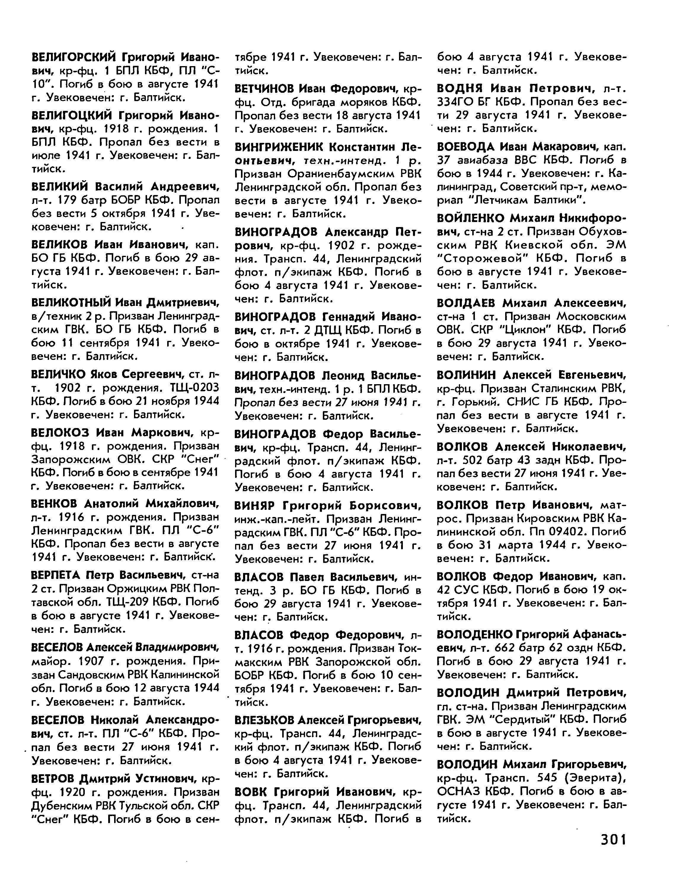 Воевода Иван Макарович, последнее место службы – 37 авиабаза ВВС КБФ; воинское звание – капитан; причина выбытия – погиб в бою; дата выбытия – 1944; название книги Памяти – Назовем поименно. Калининградская область. Том 11; увековечен – г. Калининград, Советский пр-кт, мемориал «Лётчикам Балтики».
