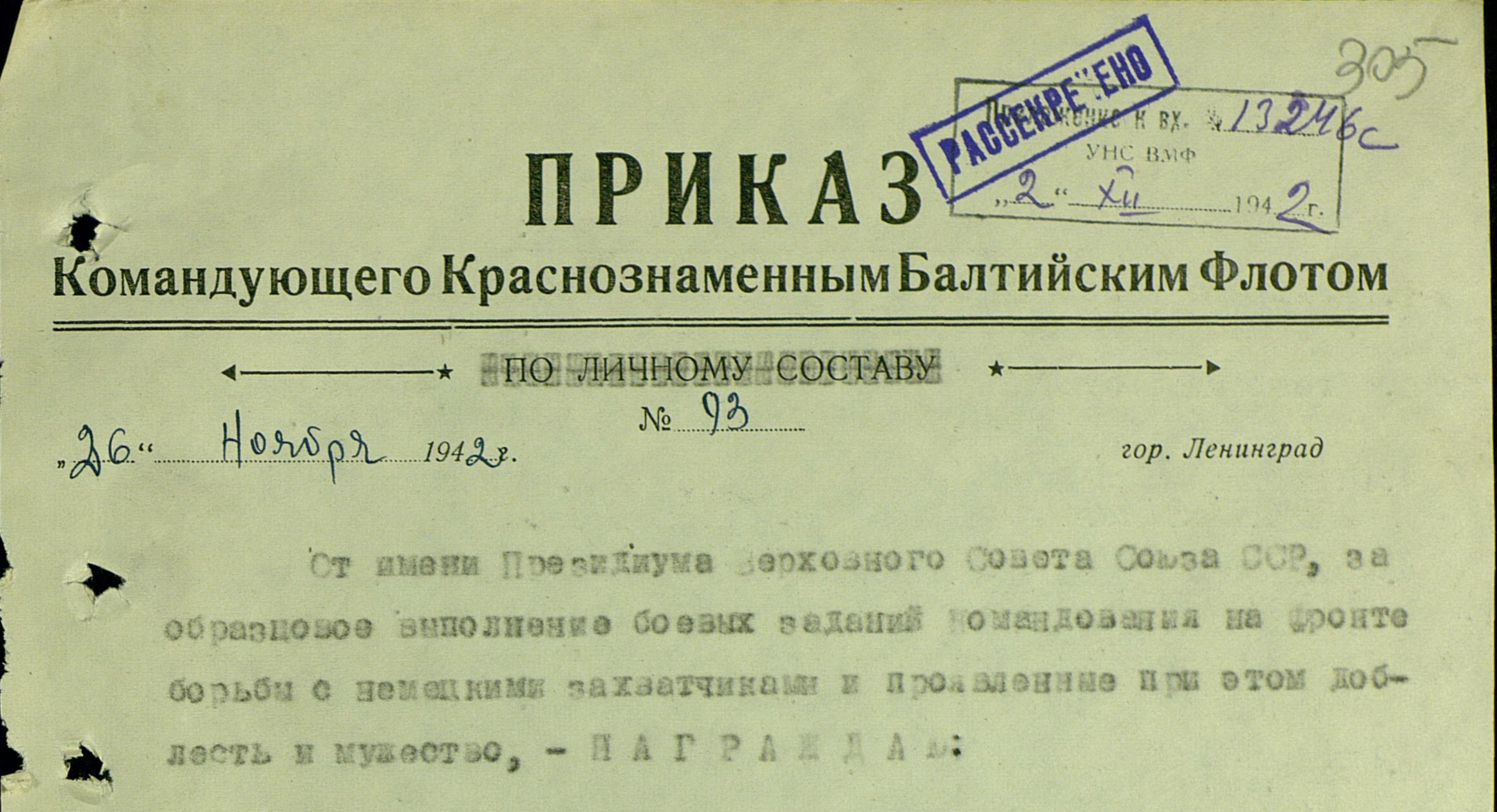 К нам поступило заявление от гражданки Корытовой О.М., матери погибшего краснофлотца Корытова Виктор Георгиевича, которая просит выслать ордена сына, как память о погибшем. По нашему учету тов. Корытов награжден орденом Отечественной войны 2 степени, приказ КСФ № 094 от 26.11.1943 года. Орден вручен 28.11.1943 года № 17921. Временное удостоверение № 34974. Прошу проверить, если тов. Корытов погиб с наградой, то нужно выйти с ходатайством перед ВС СФ о восстановлениии ордена дубликата (точнее, наверное, - "в виде дубликата" или "об изготовлении дубликата ордена" - С.Ш.) и передаче его матери - Корытовой О.М.