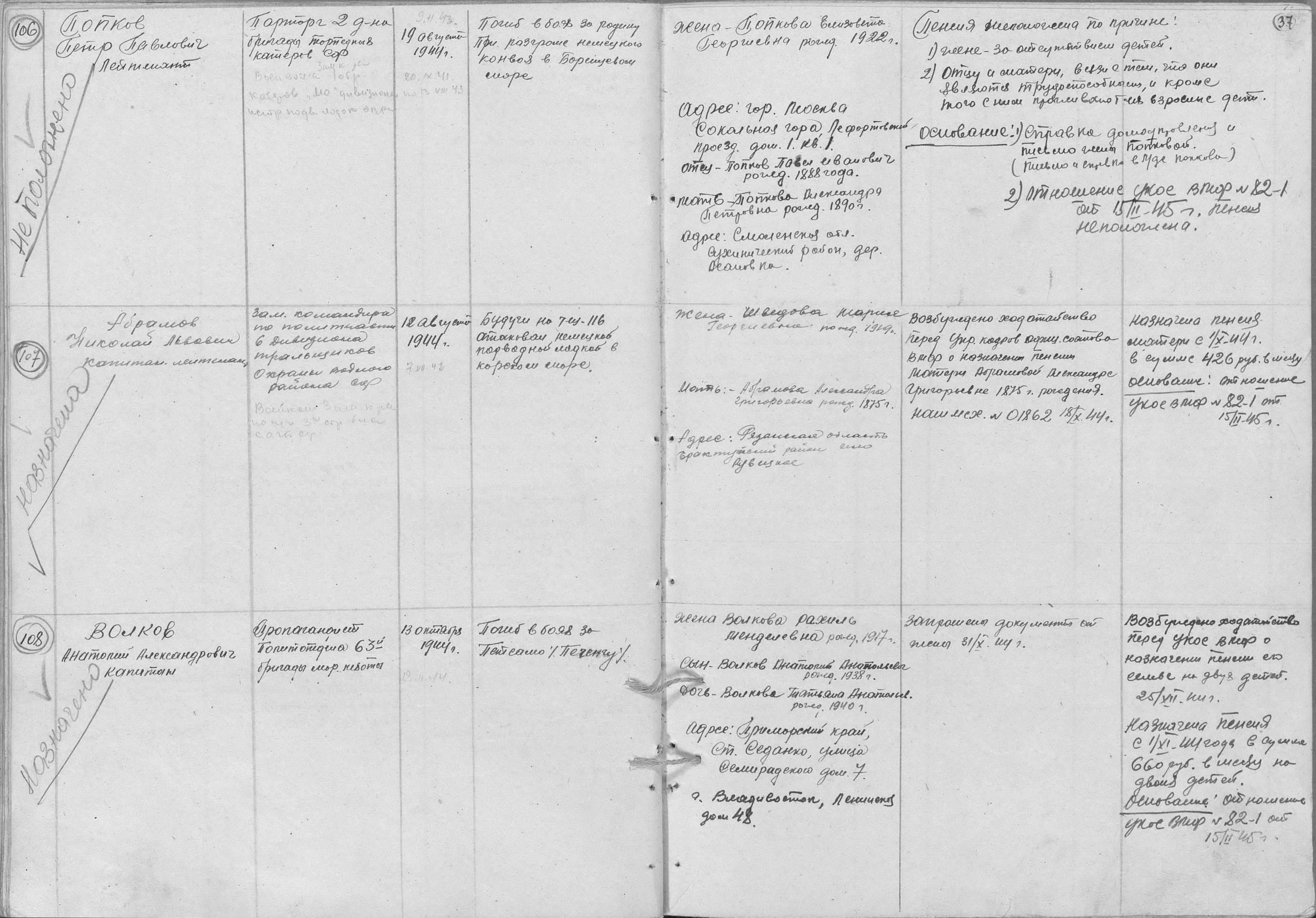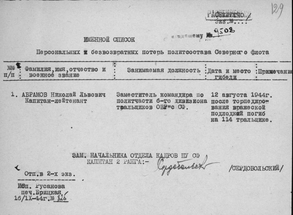 2. Абрамов Николай Львович, воинское звание – капитан-лейтенант; должность, часть – заместитель командира по политической части 6 ДТЩ Бригада траления ОВР ГБ СФ; год рождения – 1914; место рождения – Рязанская обл., Ерахтурский р-н, с. Рудецкое (ныне – территория Шиловского р-на); партийность – член ВКП (б); социальное положение – рабочий; национальность – русский; служба в армии – в РККА с 1936 (1938) г.; награды – орден Красной Звезды; по какой причине, где и когда выбыл – погиб в море при выполнении боевого задания 12.08.1944 г.; семейное положение – женат; родственники (ФИО, адрес) – жена, Шведова Мария Георгиевна, мать, Абрамова Александра Григорьевна, проживают по месту рождения погибшего; дополнительная информация – по факту гибели назначена пенсия матери с 01.09.1944 в сумме 426 руб.