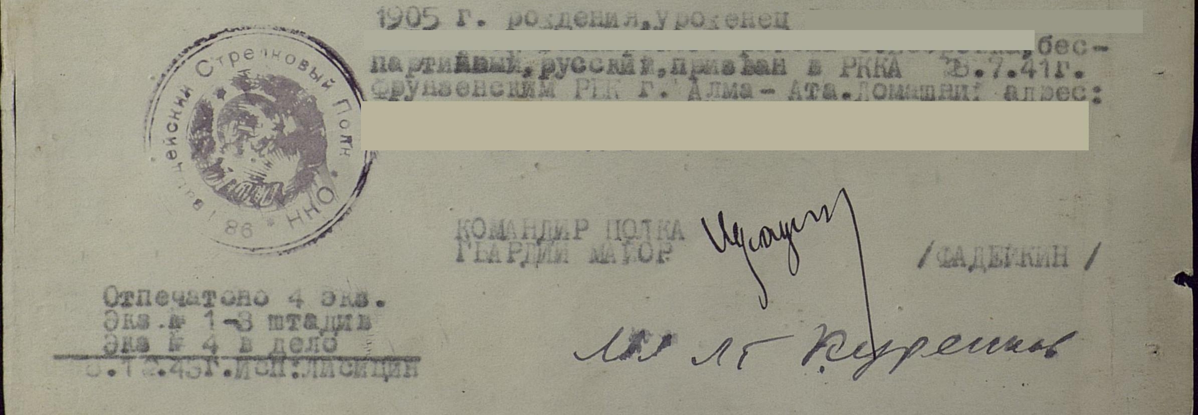 гвардии рядовой); военно-учетная специальность – ВУС № 134; место службы – 391 ЗСП 29 ЗСД, в/ч 12205 (г. Вологда), по распоряжению Главупраформа Красной Армии (наряд № М/4/8388) из числа военнообязанных нестроевиков в/ч 12205 был направлен для работы в арктические предприятия ГУСМП; год рождения – 1896; место рождения – Смоленская обл., Кардымовский (Кардынский) р-н, Залесовский с/с, д. Черниково; партийность – б/п; национальность –