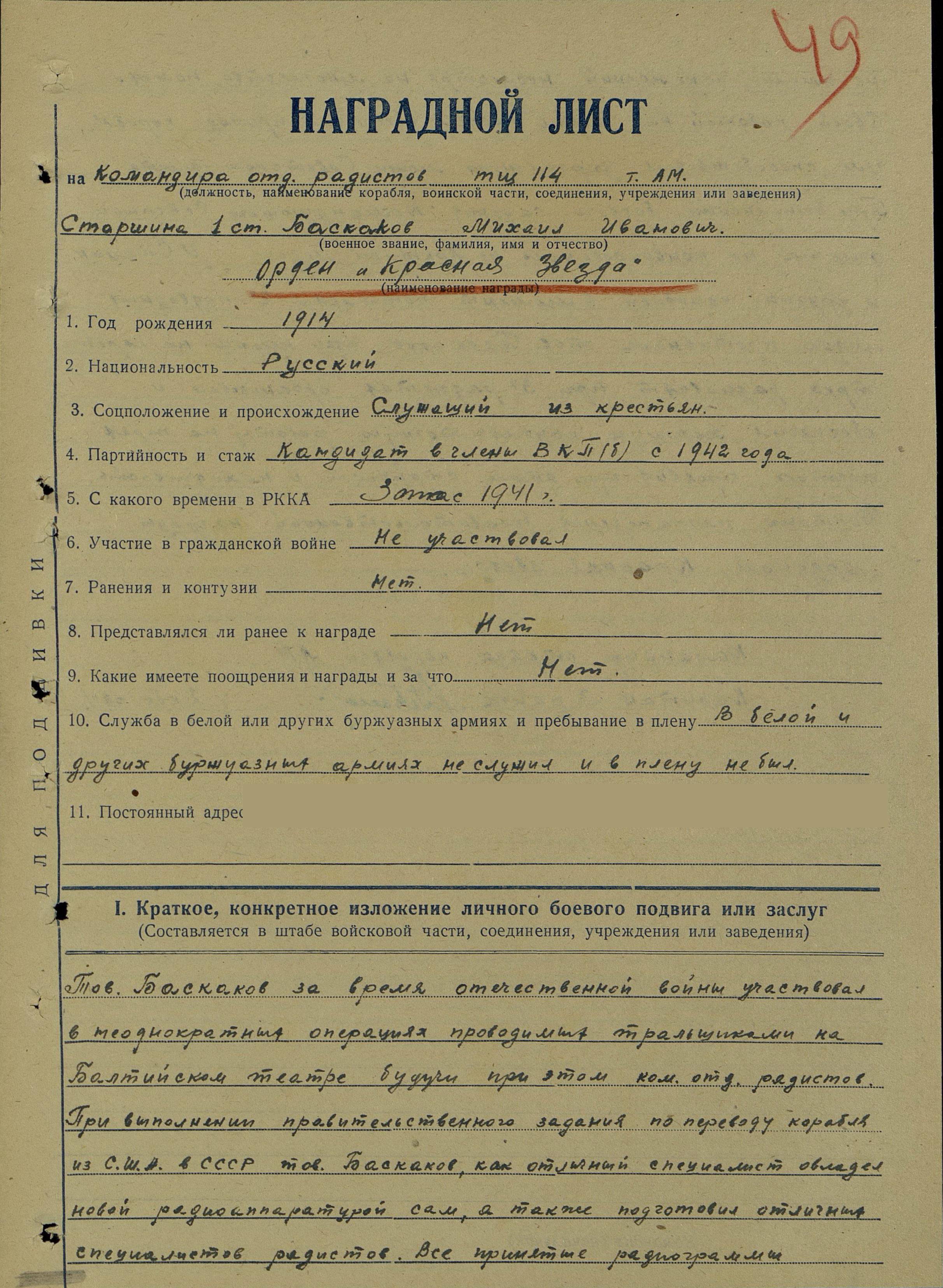 Тов. Баскаков за время Отечественной войны участвовал в неоднократных операциях проводимых тральщиками на Балтийском театре, будучи при этом командиром отделения радистов. При выполнении правительственного задания по переводу корабля из США в СССР тов. Баскаков как отличный специалист овладел новой радиоаппаратурой сам, а также подготовил отличных специалистов-радистов. Все принятые радиограммы не имели искажений, несмотря на множество помех. Своей работой на боевом посту обеспечил приход корабля, чем способствовал укреплению мощи Советского флота.