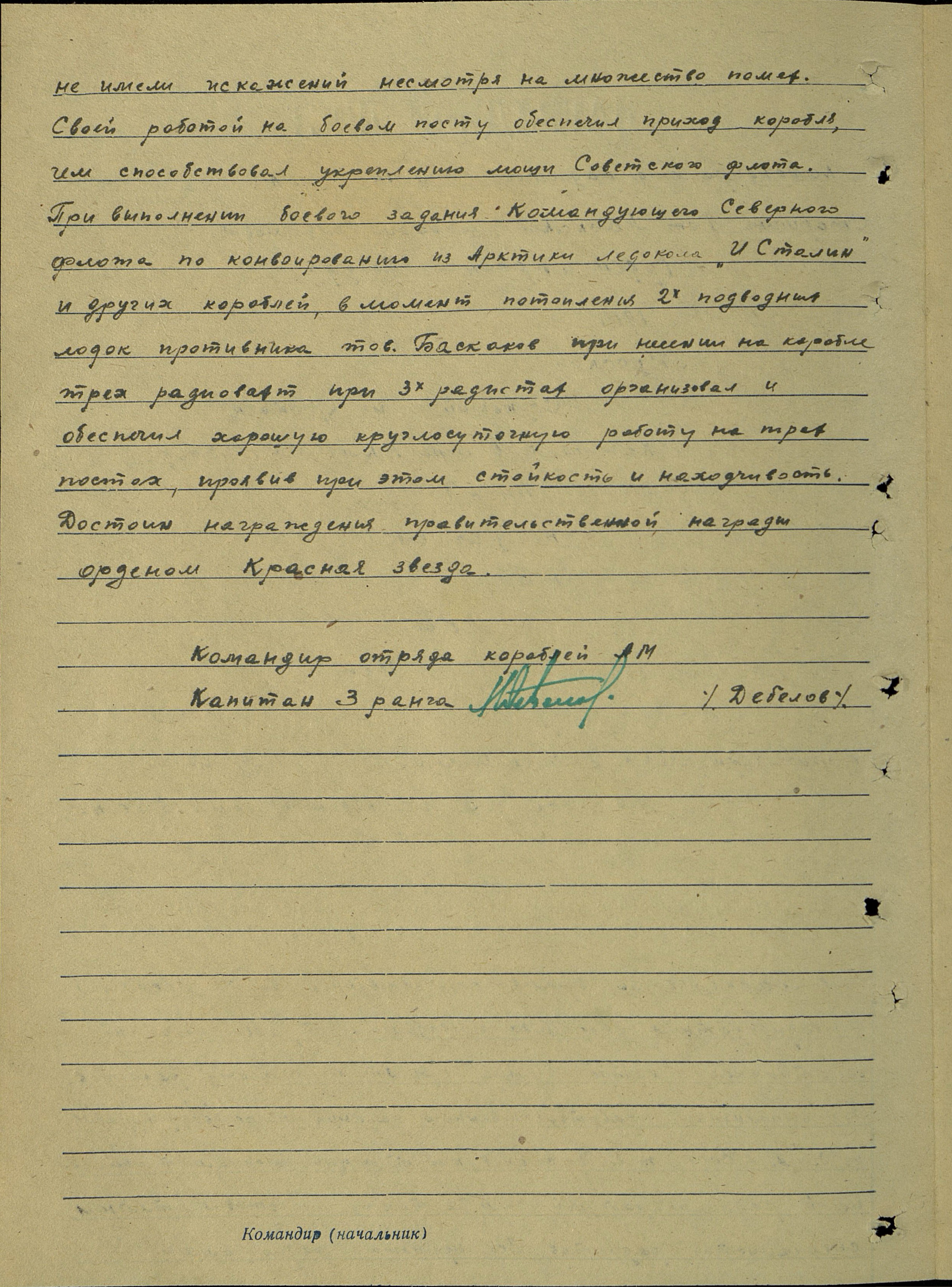 При выполнении боевого задания Командующего СФ по конвоированию из Арктики ледокола «И. Сталин» и других кораблей, в момент потопления 2 подводных лодок противника тов. Баскаков при несении на корабле трех радиовахт при трех радистах организовал и обеспечил хорошую круглосуточную работу на трех постах, проявив при этом стойкость и находчивость.
