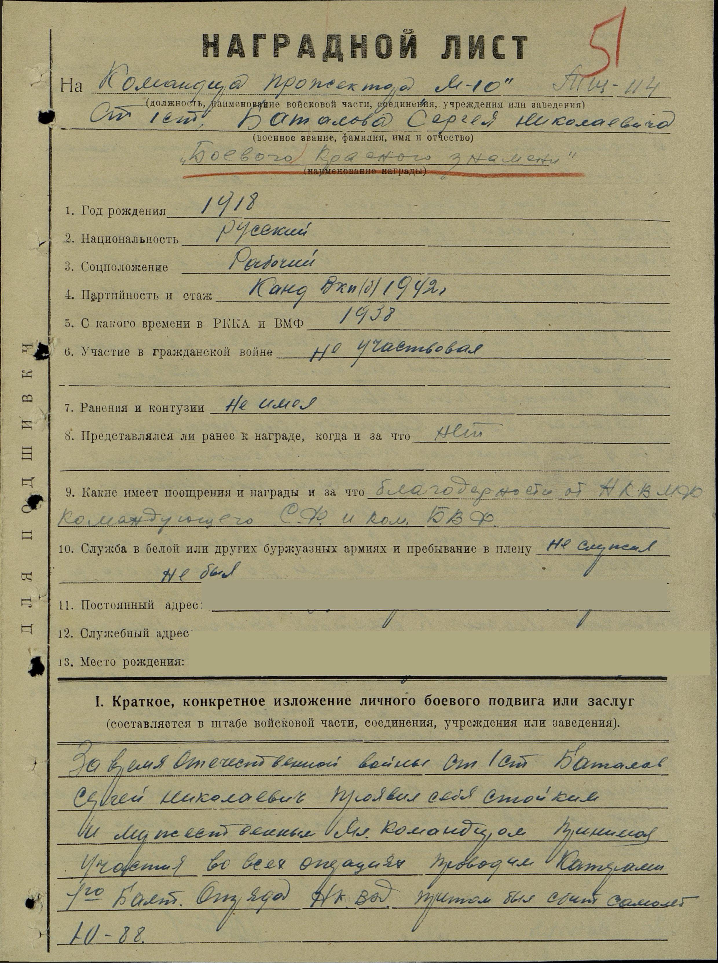 кандидат в члены ВКП(б) с 1942 г.); социальное положение – рабочий; национальность – русский; срок срочной службы – 1938 г.; каким РВК призван – Уфимским РВК; награды – орден Красного Знамени; по какой причине, где и когда выбыл – погиб в море при выполнении боевого задания 12.08.1944 г.; семейное положение – холост; родственники (ФИО, адрес) – мать, Баталова Вера Васильевна, Покровский р-н, с. Федоровка;