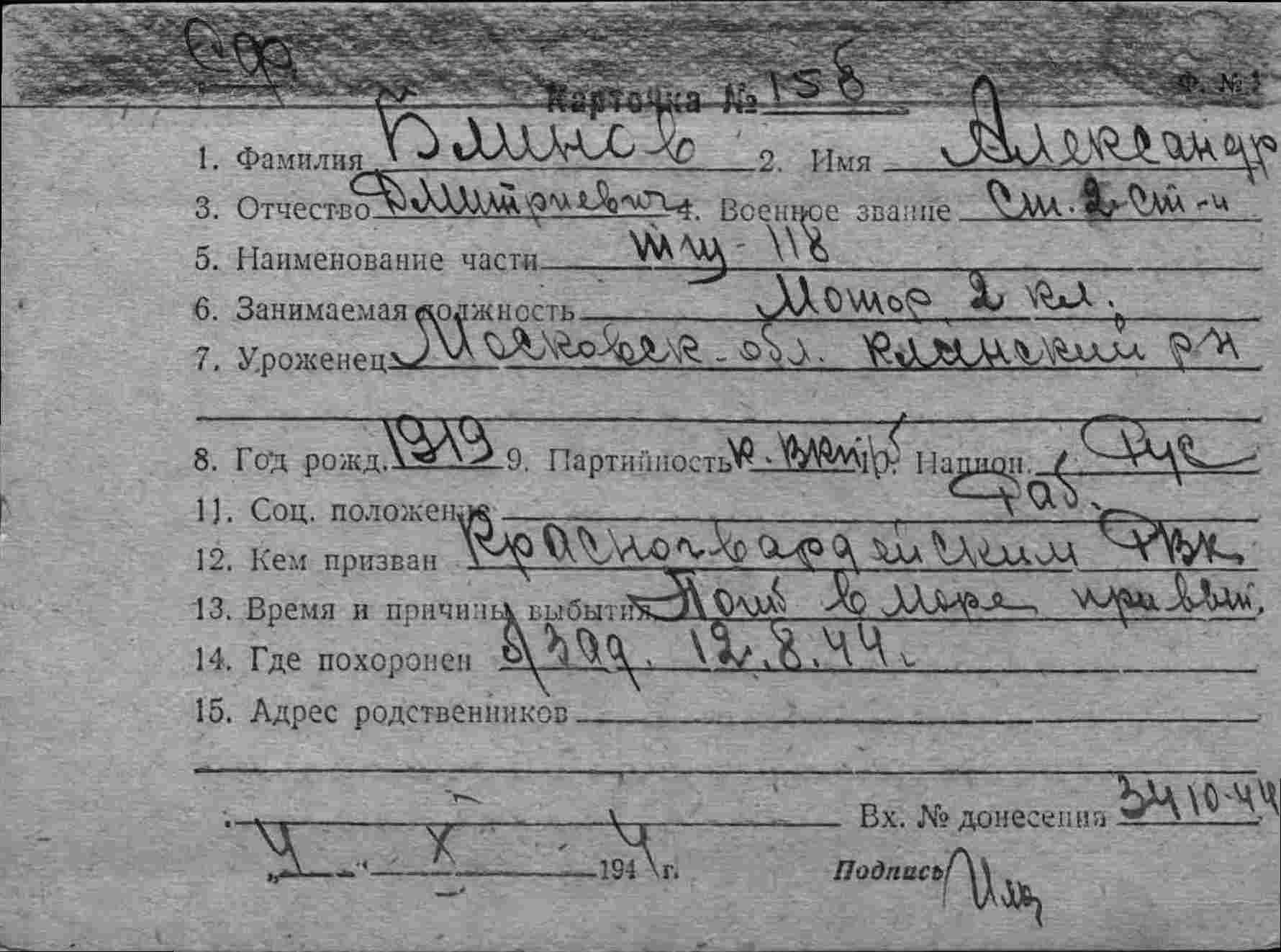Донесение о безвозвратных потерях 3410 от 03.10.1944 (ЦВМА, Ф. 864, О. 1, Д. 1358).