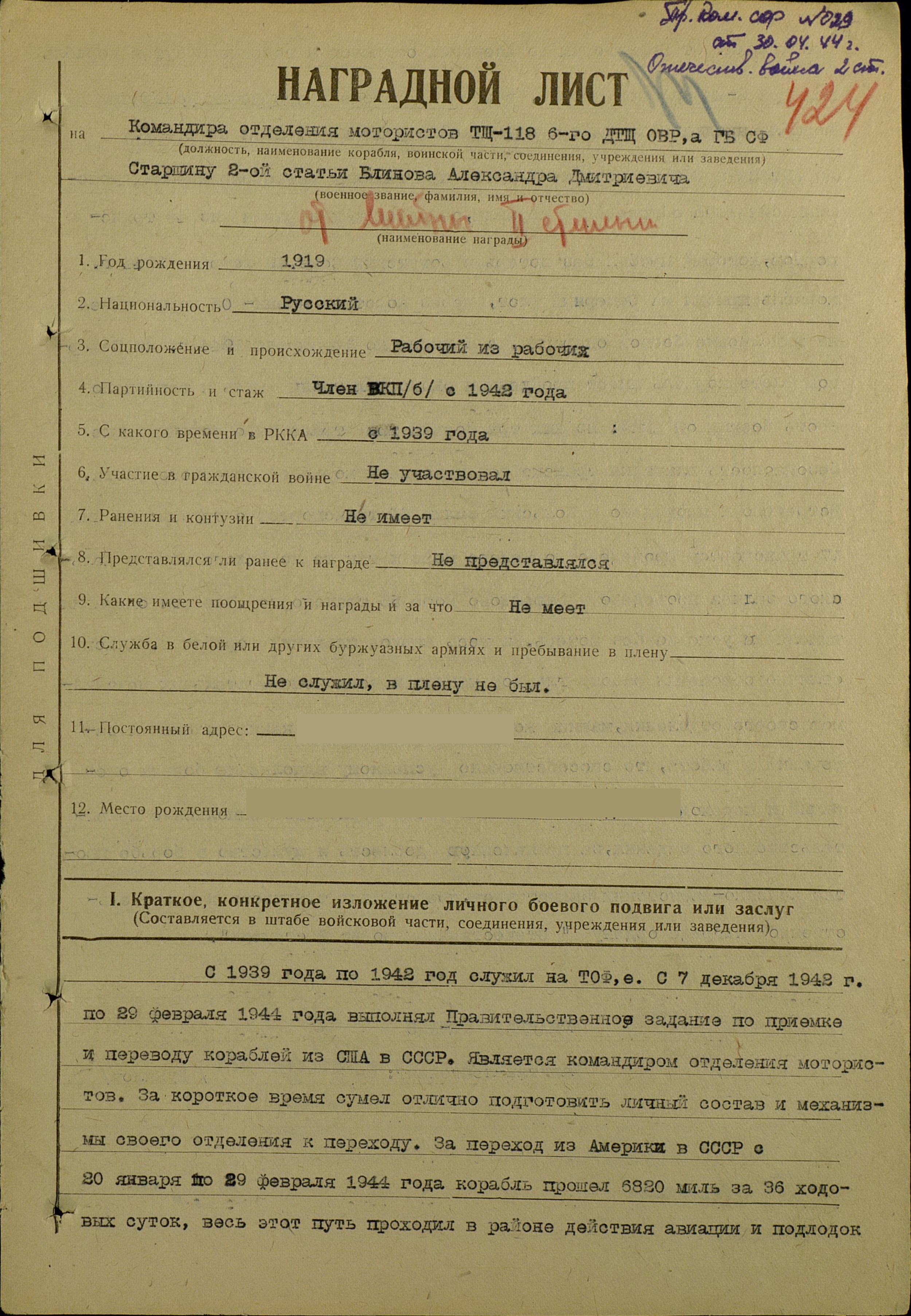 Из Англии в СССР в течение 9 суток при тяжелых метеорологических условиях, сильного обледенения корабля сопровождали караван из 43 транспортов, который прибыл без потерь в Советский Союз. 29 февраля 1944 г. корабль прибыл на СФ, через короткое время – 5 марта – вышел на выполнение боевой операции, с 5 марта по 14 апреля 1944 г. на СФ корабль имеет пройденными 2000 мили и выполнил 6 боевых операций, из них 3 боевых траления, обеспечивающих безопасность плавания транспортов и военных кораблей СФ. Встречено и проведено в Кольский залив 65 транспортов с грузом, из них 17 транспортов проведено до Белого моря и так же из Белого моря и Кольского залива проведено в Баренцево море 55 транспортов. Все эти операции выполнены успешно без потерь. За весь период плавания корабля тов. Блинов отлично обеспечил работу главной машины и всех вспомогательных механизмов своего отделения, машины которого не имеют ни каких поломок и замечаний в работе, что способствовало успешному выполнению боевых операций и перехода корабля из США в СССР.