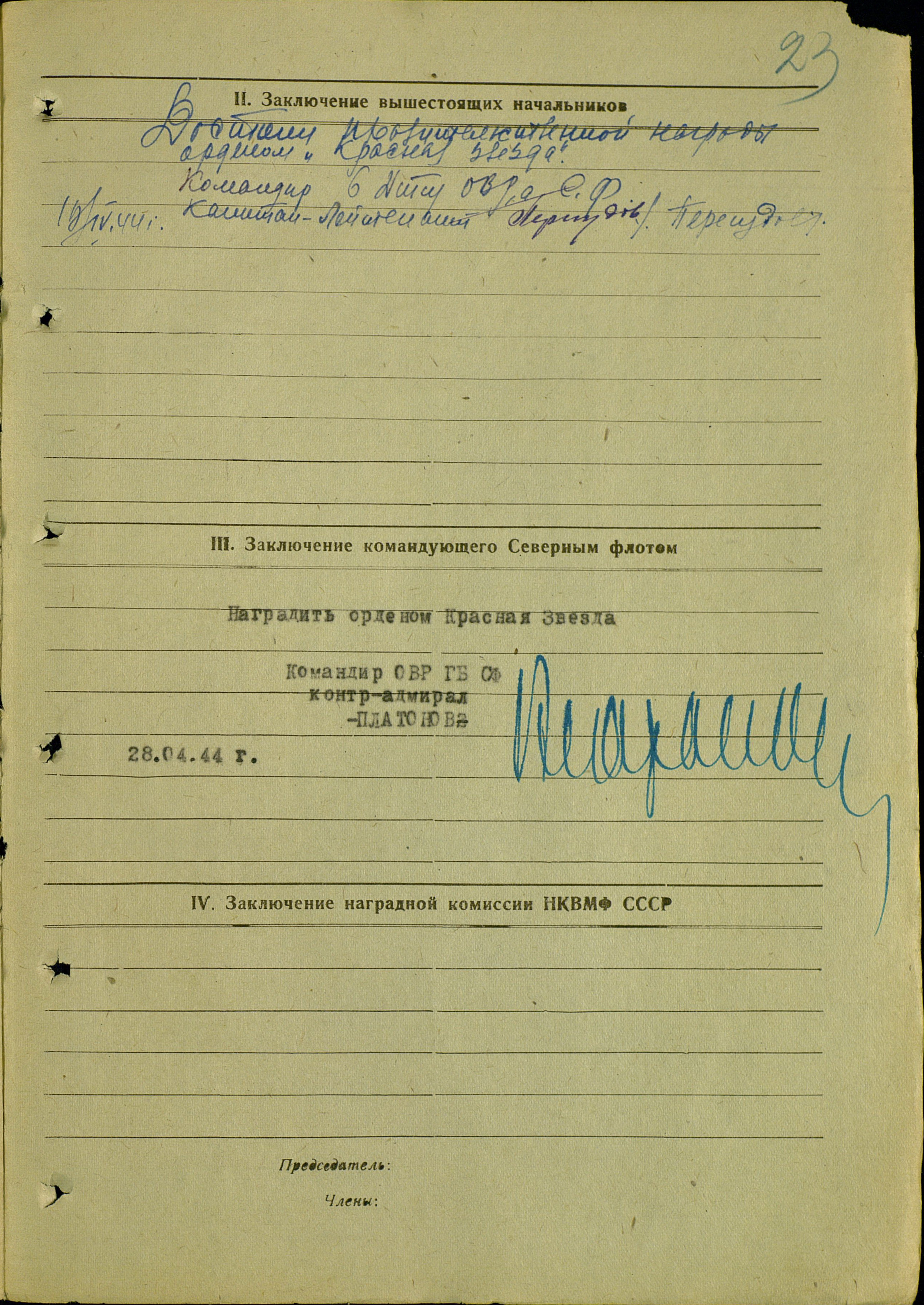 командир отделения минеров, ТЩ-119 6 ДТЩ ОВР ГБ СФ); год рождения – 1918; место рождения – г. Горький (ныне – г. Нижний Новгород); партийность – б/п; социальное положение и происхождение – рабочий (