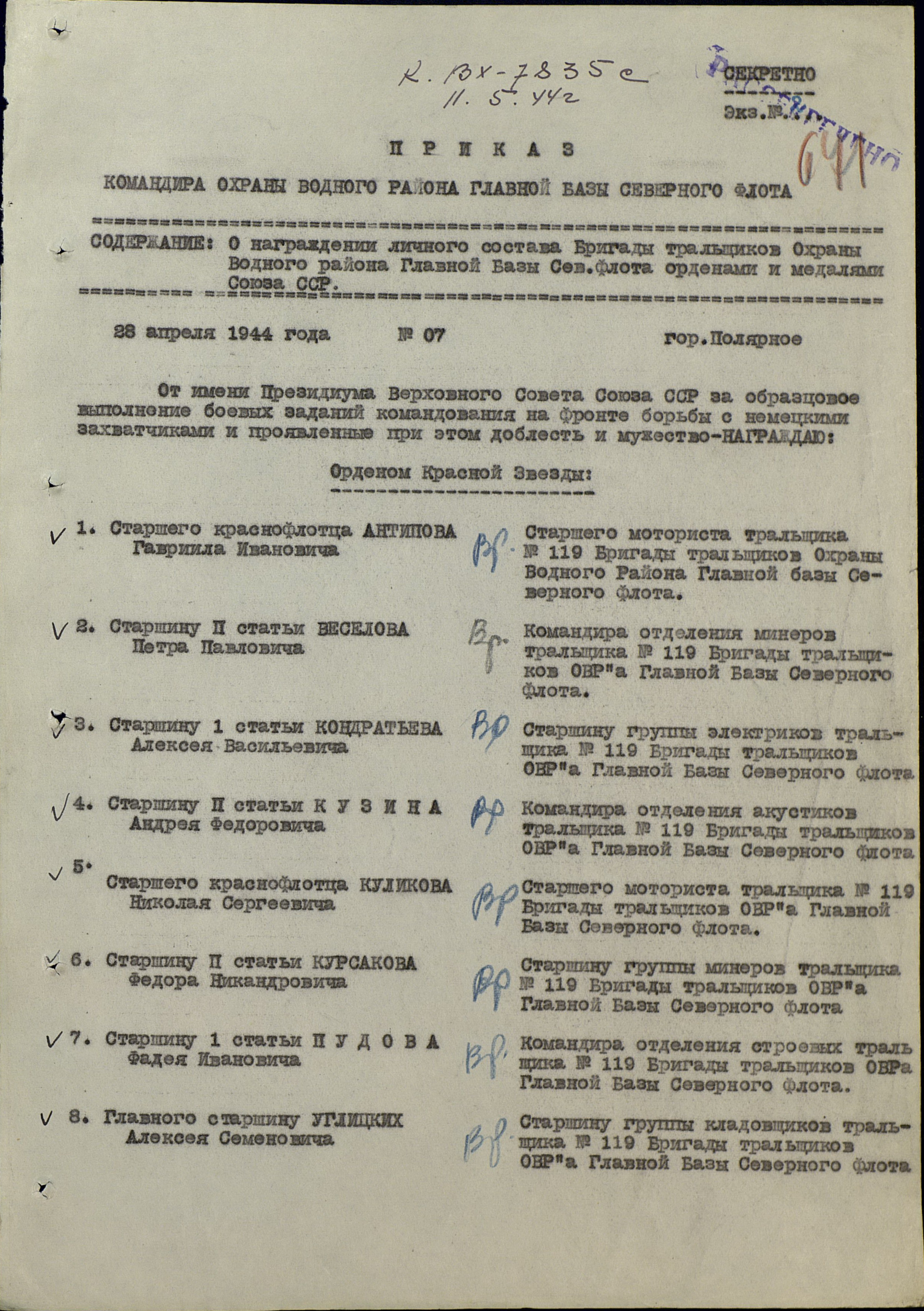 Веселов Петр Павлович, воинское звание – старшина 2 статьи; должность (специальность), часть – старшина отделения минеров, минер 2 кл., тральщик ТЩ-118 6 ДТЩ Бригада траления ОВР ГБ СФ (