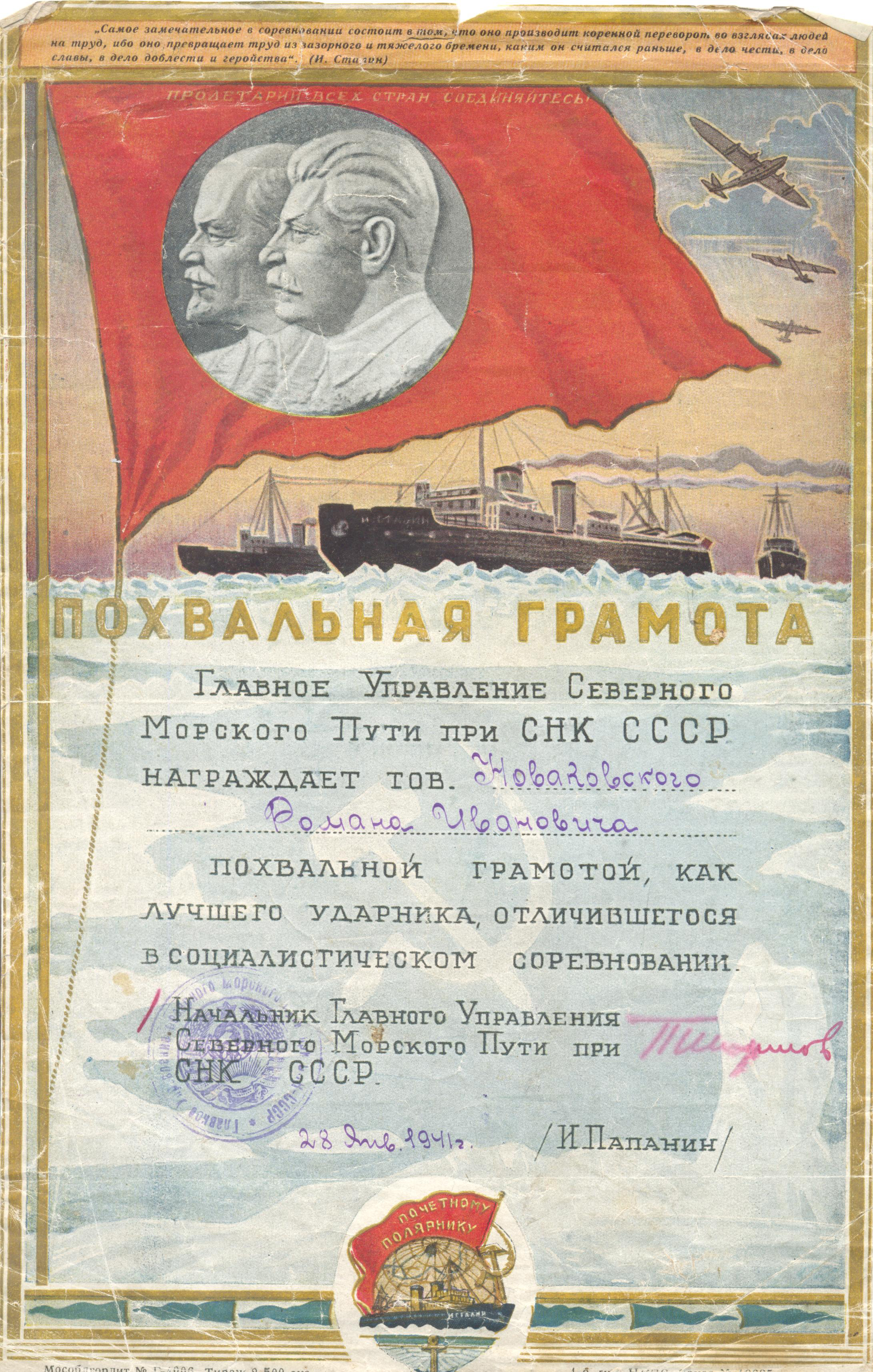 Главное Управление Северного Морского Пути при СНК СССР награждает тов. Новаковского Романа Ивановича похвальной грамотой, как лучшего ударника, отличившегося в социалистическом соревновании.