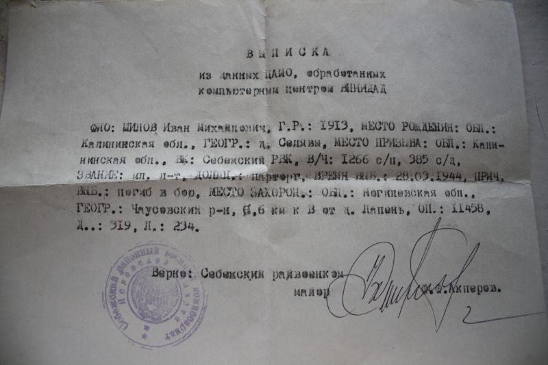 Высылаю Вам 2 фотографии Шилова Ивана Михайловича. И фотографию архивной справки о его месте захоронения: