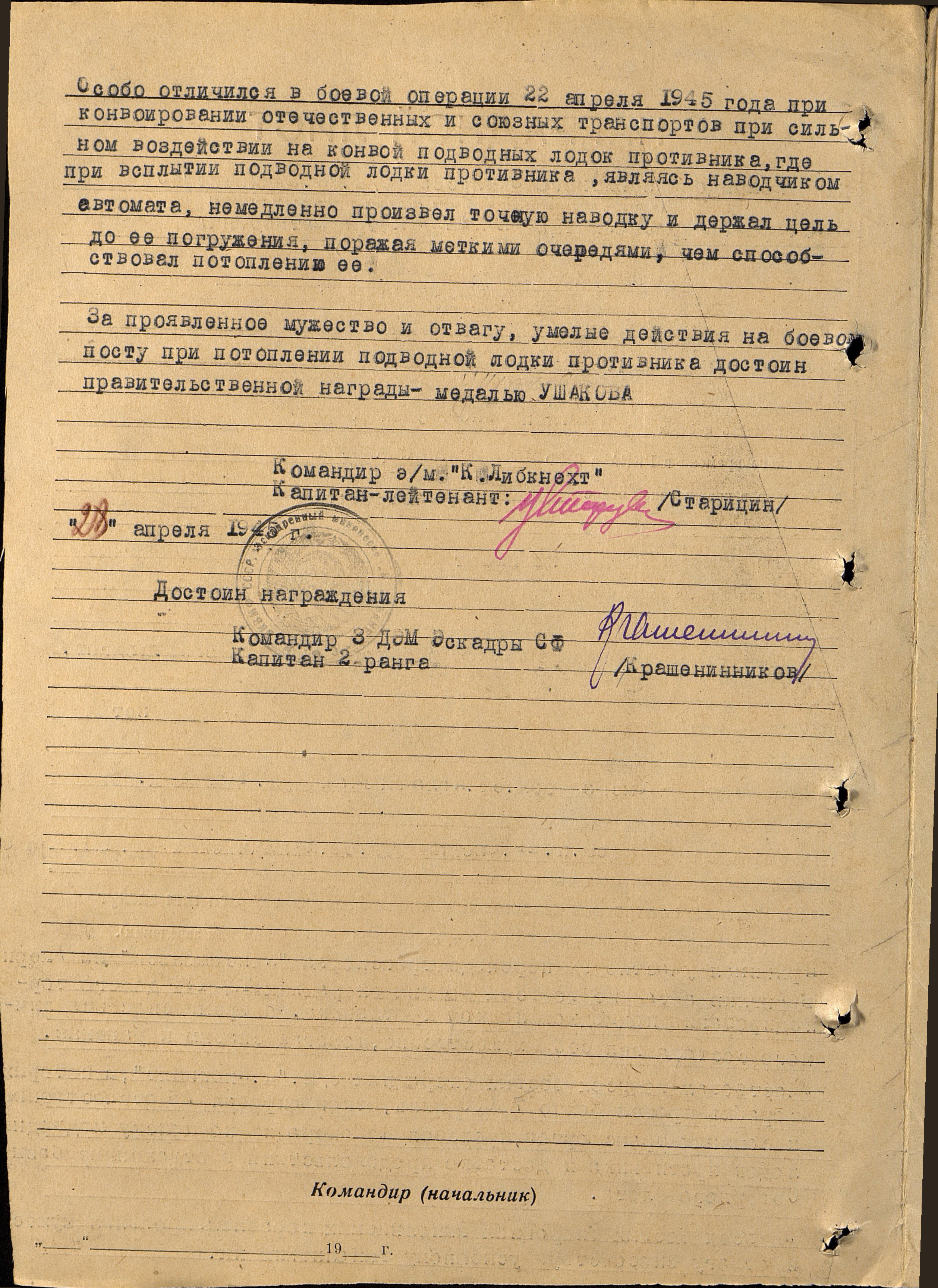 За проявленные мужество и отвагу, умелые действия на боевом посту при потопления подводной лодки противника достоин правительственной награды – медали Ушакова.