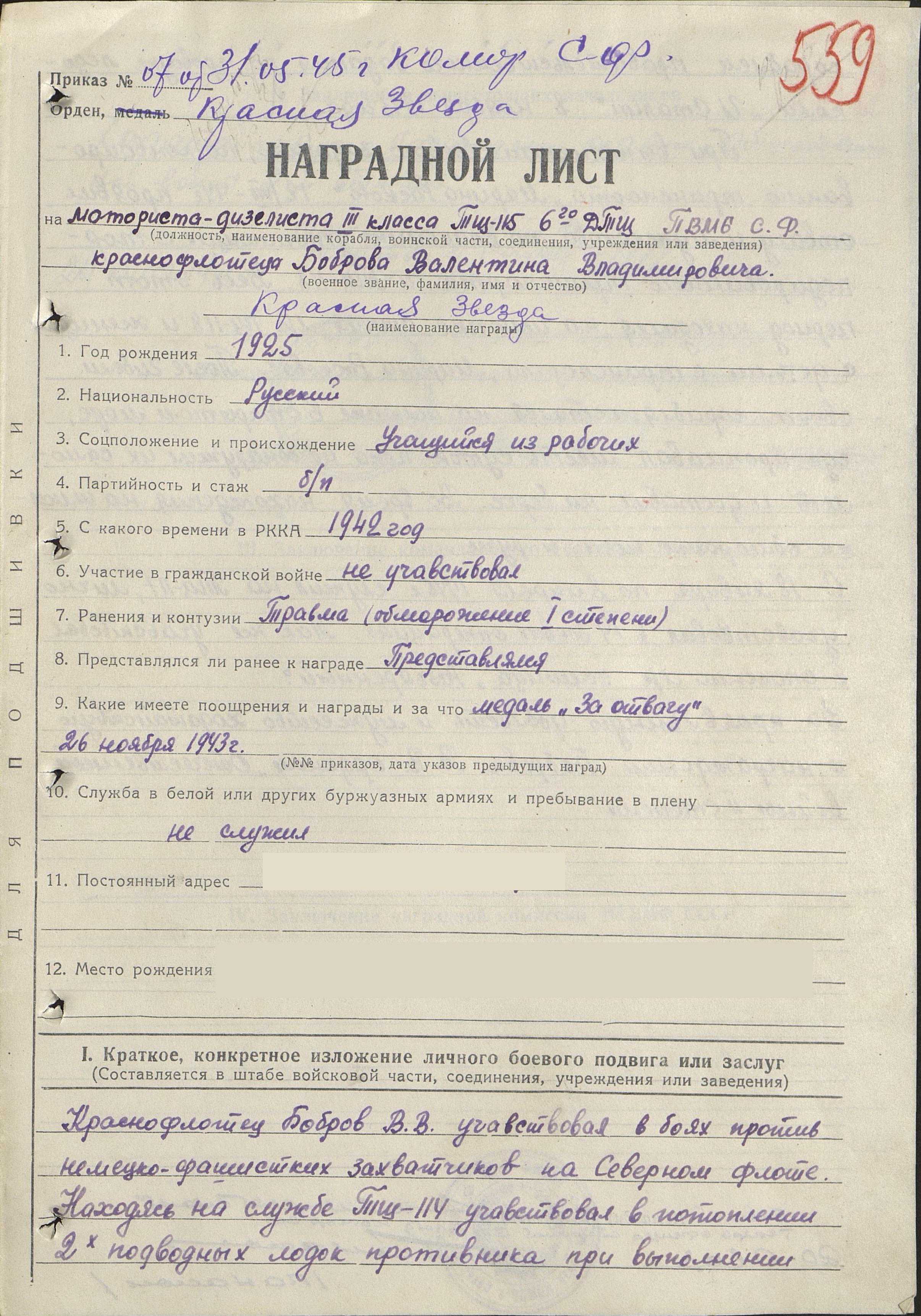 Юнга Бобров прибыл на ТЩ-114 в Полярном, перед ним была поставлена задача быстро овладеть техникой, был прикреплен ст. специалисту. Прилагая старание и настойчивость, т. Бобров быстро овладел техникой и был допущен к самостоятельной вахте. Выполняя задание по конвоированию ледоколов, были уничтожены две подводные лодки, пытавшееся торпедировать ледокол «И. Сталин». Немалая заслуга [в потоплении подводных лодок противника] т. Боброва, он стоял на вахте у вспомогательных механизмов и обеспечил [их] бесперебойную работу, проявляя стойкость и мужество.