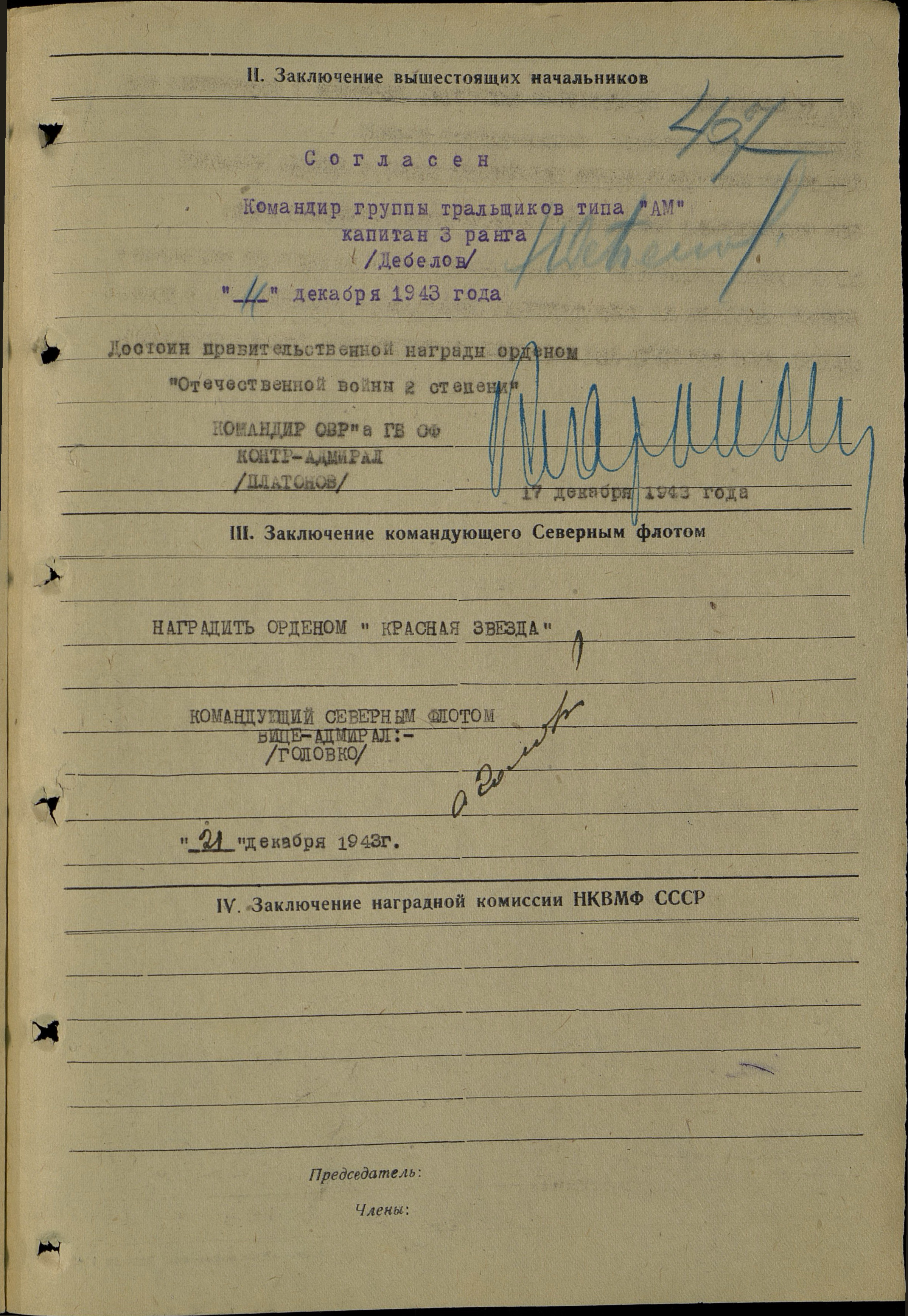 За мужество и отвагу, проявленные при спасении личного состава и при выполнении боевых заданий, представляю к правительственной награде – ордену Отечественной войны I степени.