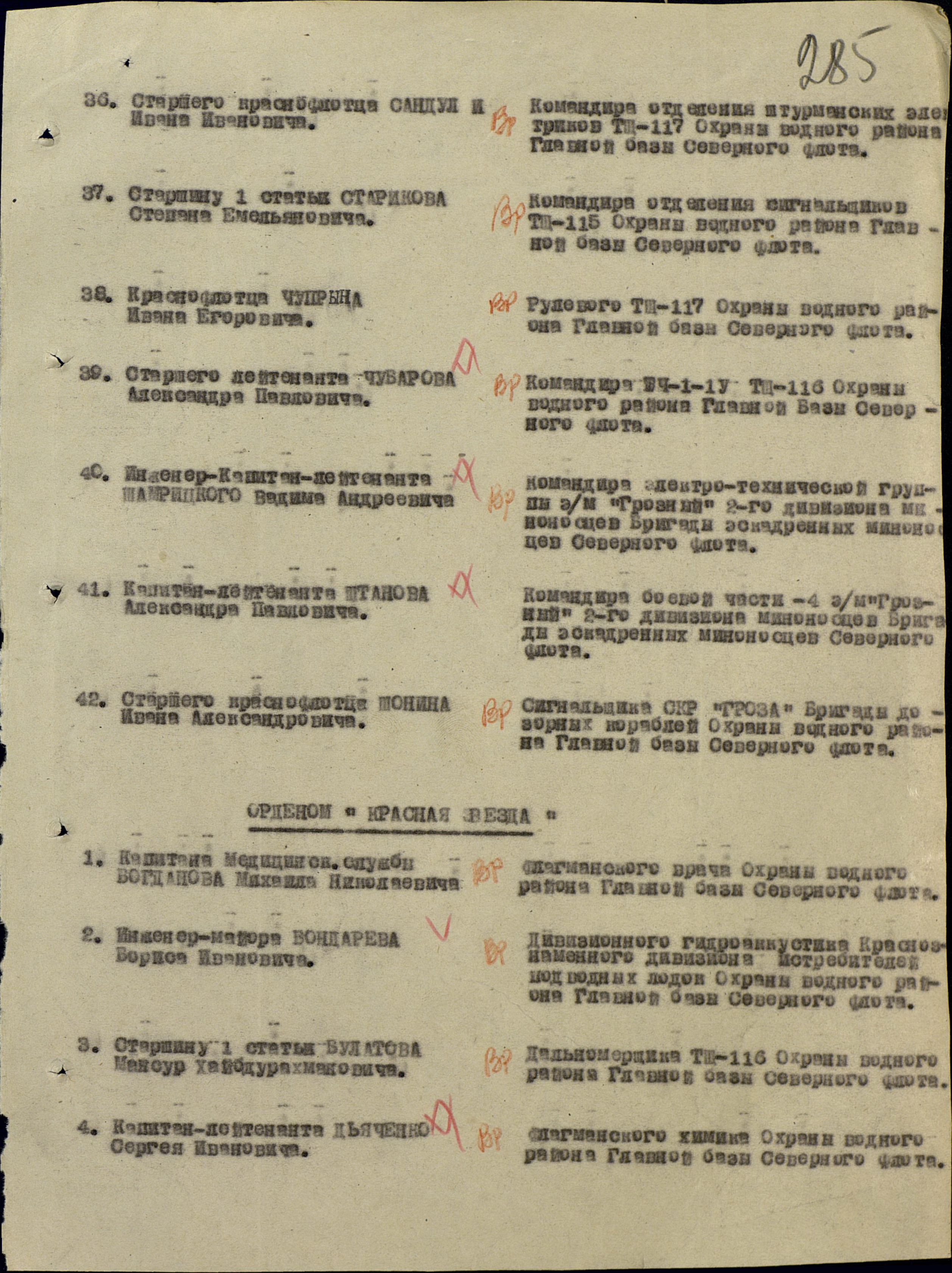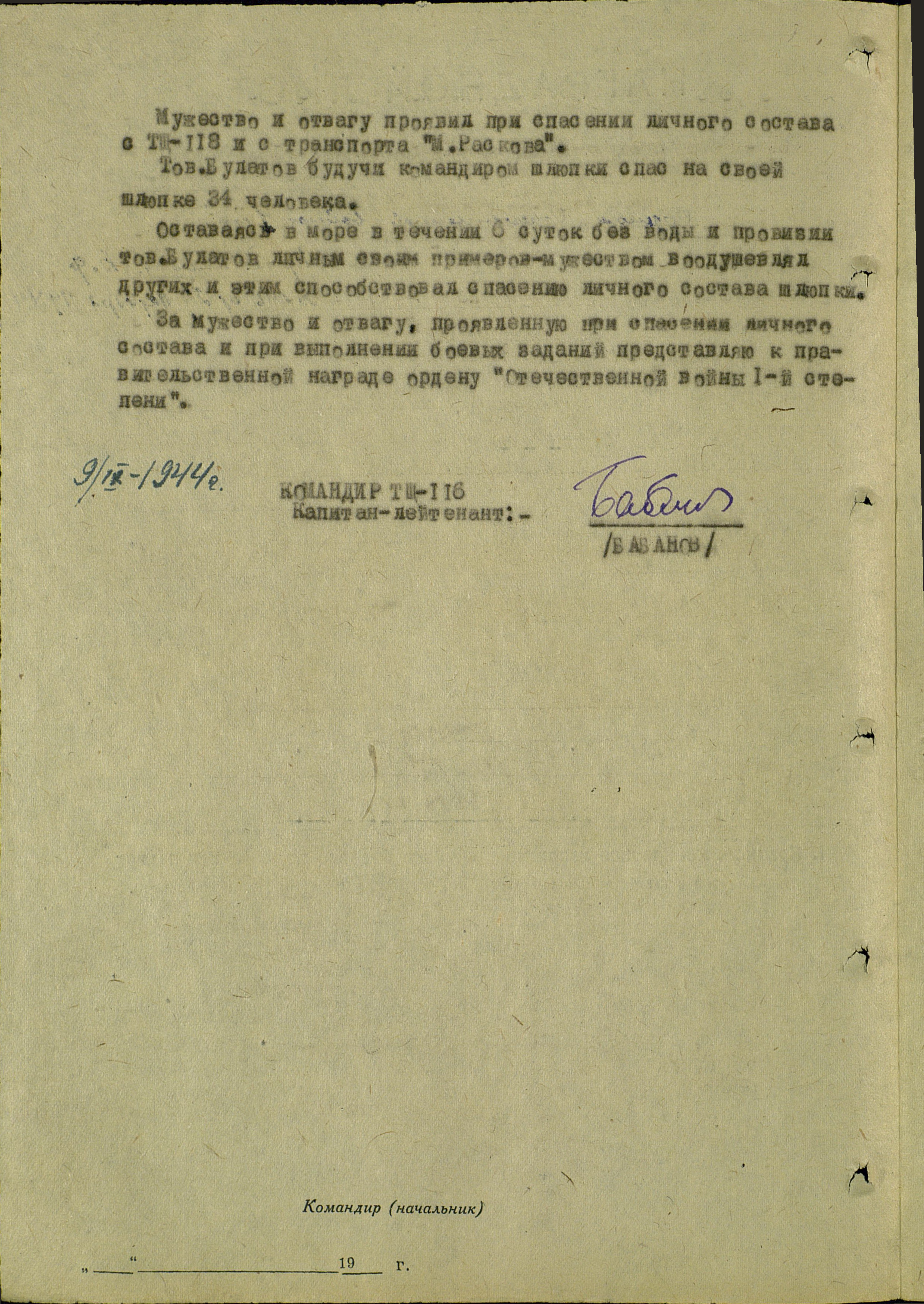 За отличное выполнение правительственного задания и за выполнение боевой операции по конвоированию транспортов ходатайствую о награждении тов. Булатова М.Х орденом Отечественной войны II степени.