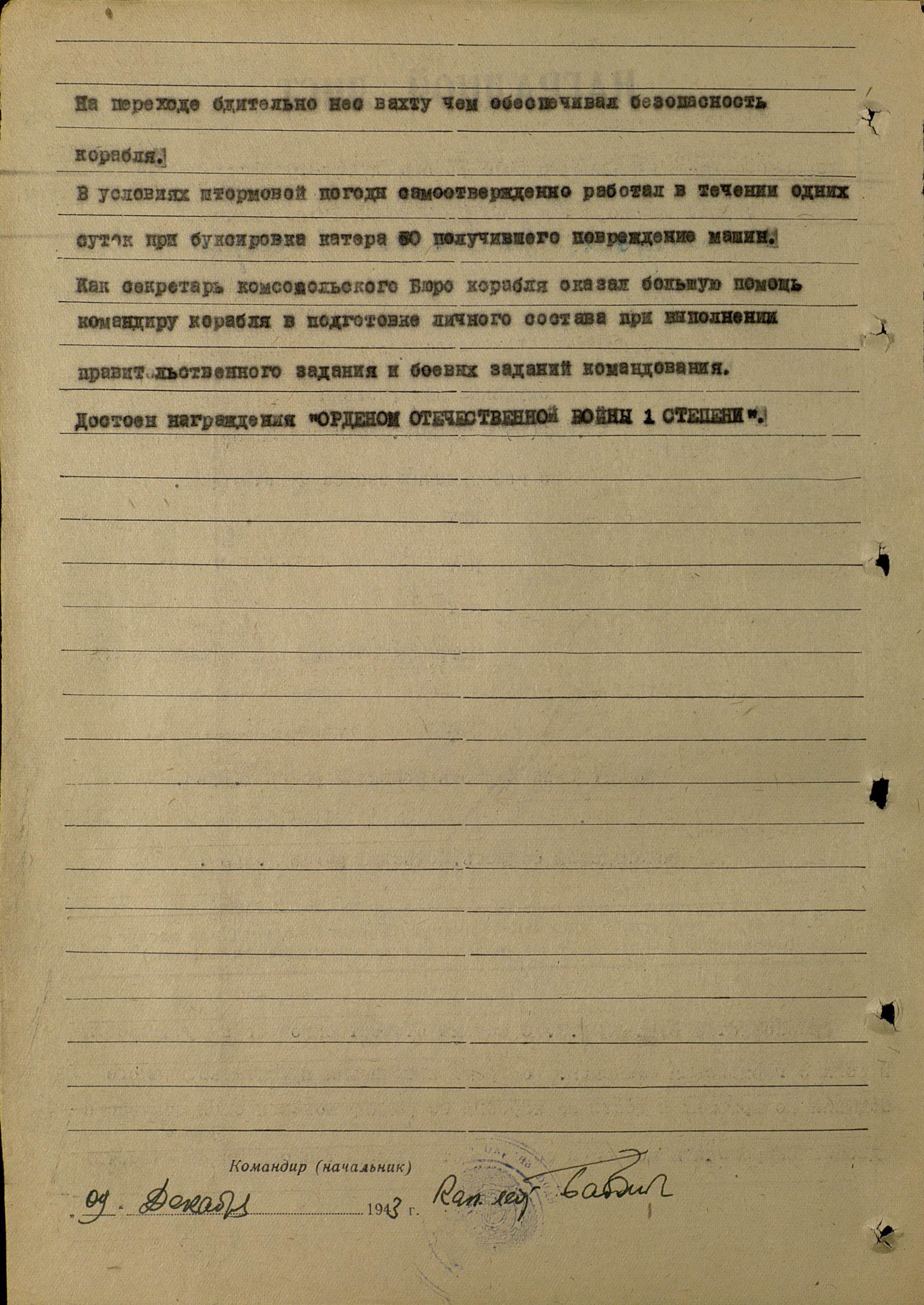 24 октября 1944 г. при потоплении второй подводной лодки противника и выполнении трех правительственных заданий по конвоированию и др., как парторг корабля умело организовал личный состав на лучшее выполнение боевых заданий, что являлось большой повседневной помощью командованию корабля, в деле мобилизации личного состава на лучшее выполнение боевых заданий.