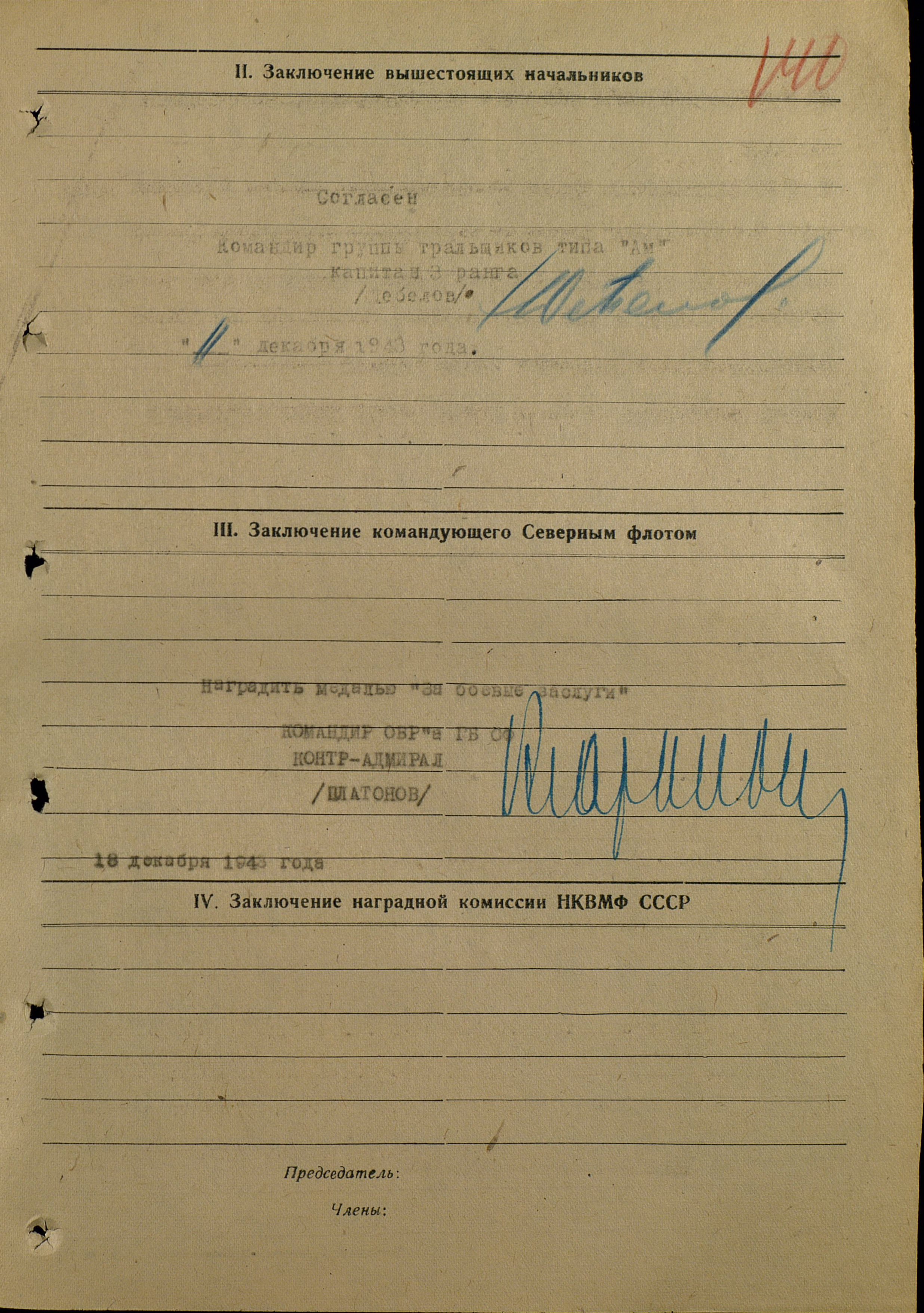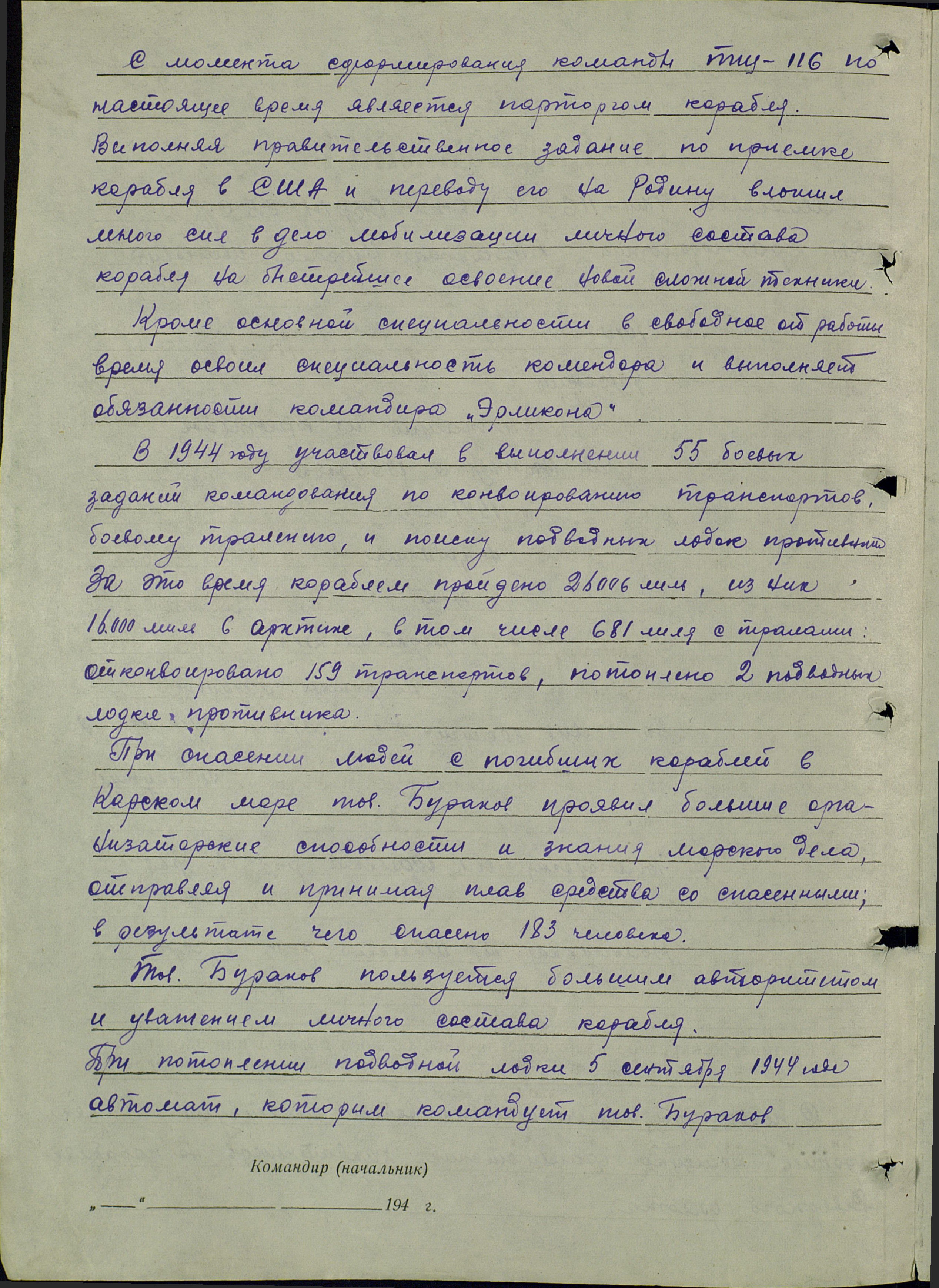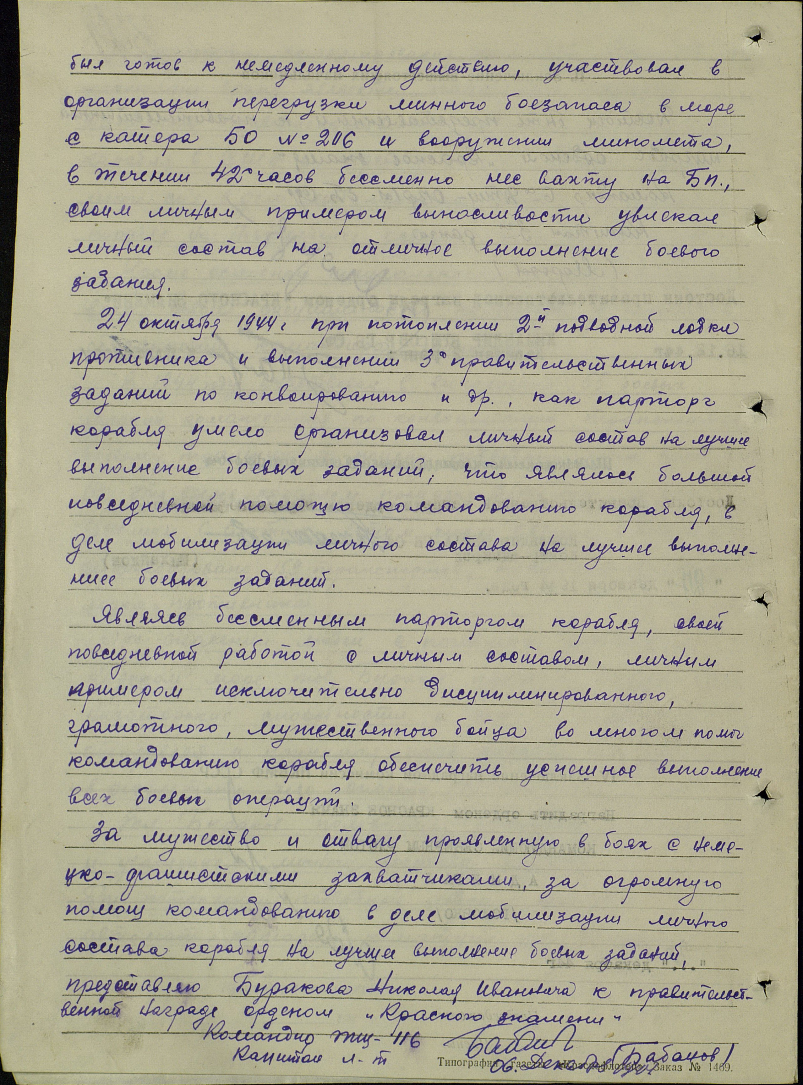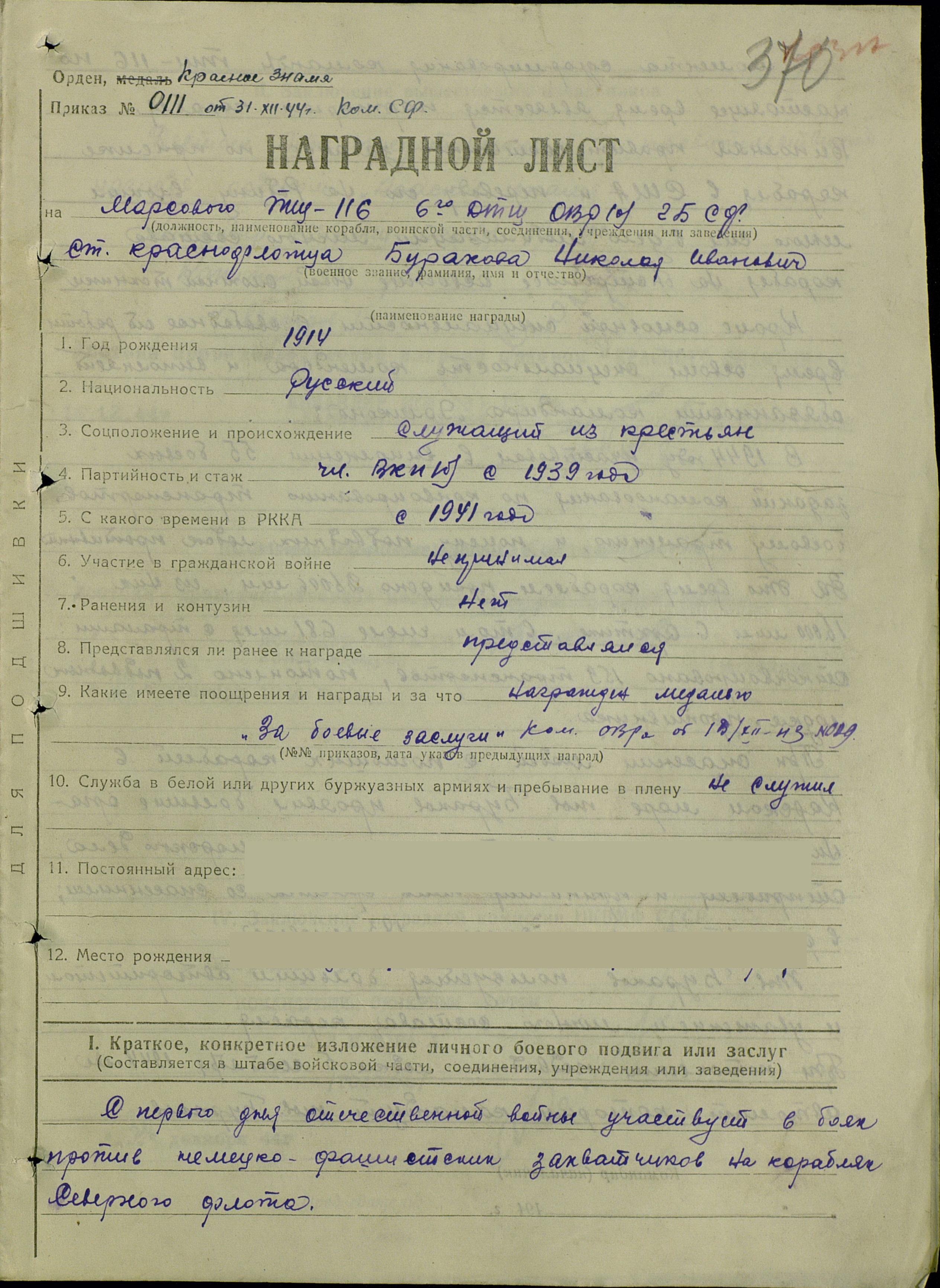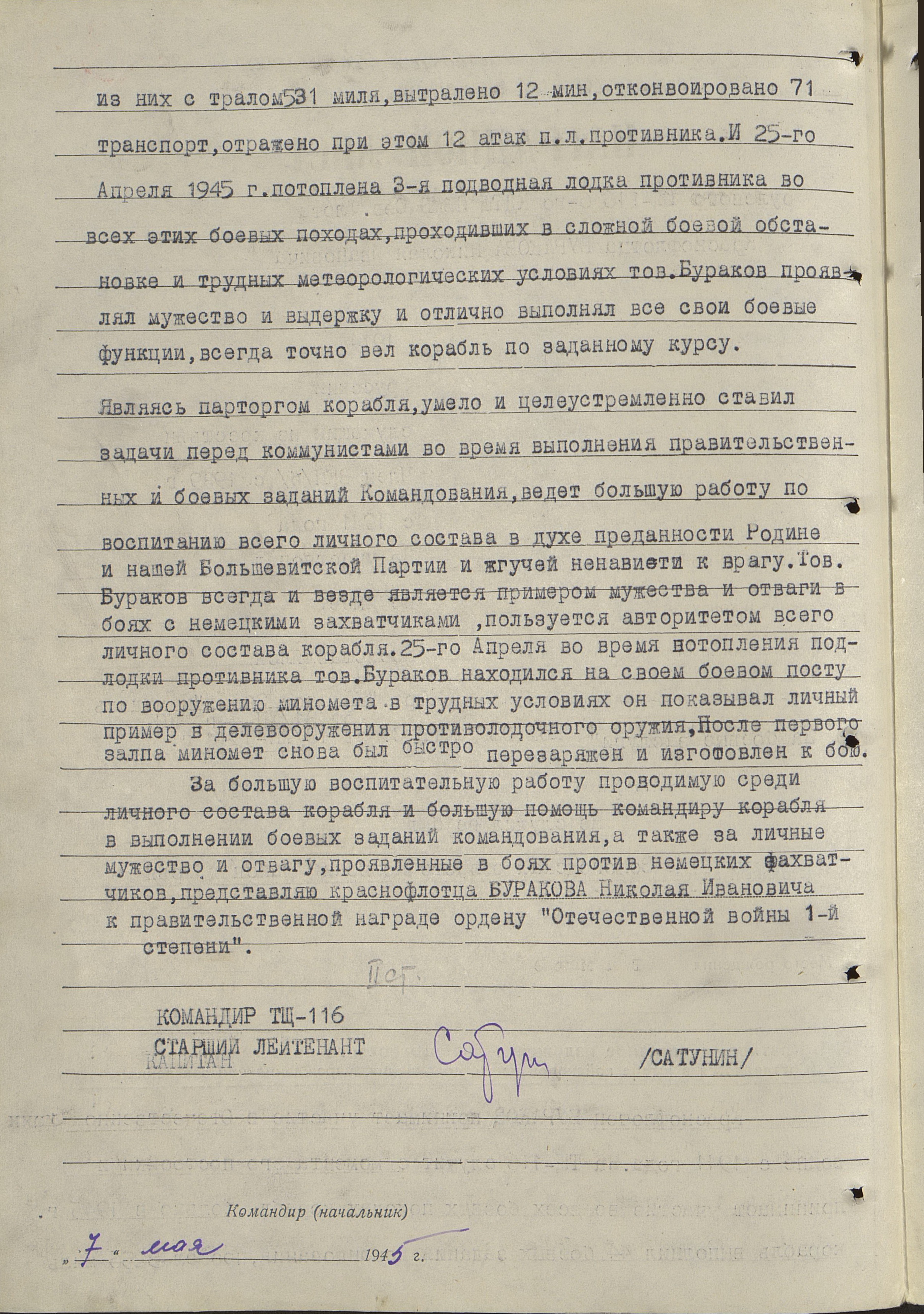 За мужество и отвагу, проявленные в боях с немецко-фашистскими захватчиками, за огромную помощь командованию в деле мобилизации личного состава корабля на лучшее выполнение боевых заданий представляю Буракова Николая Ивановича к правительственной награде – ордену Красного Знамени.