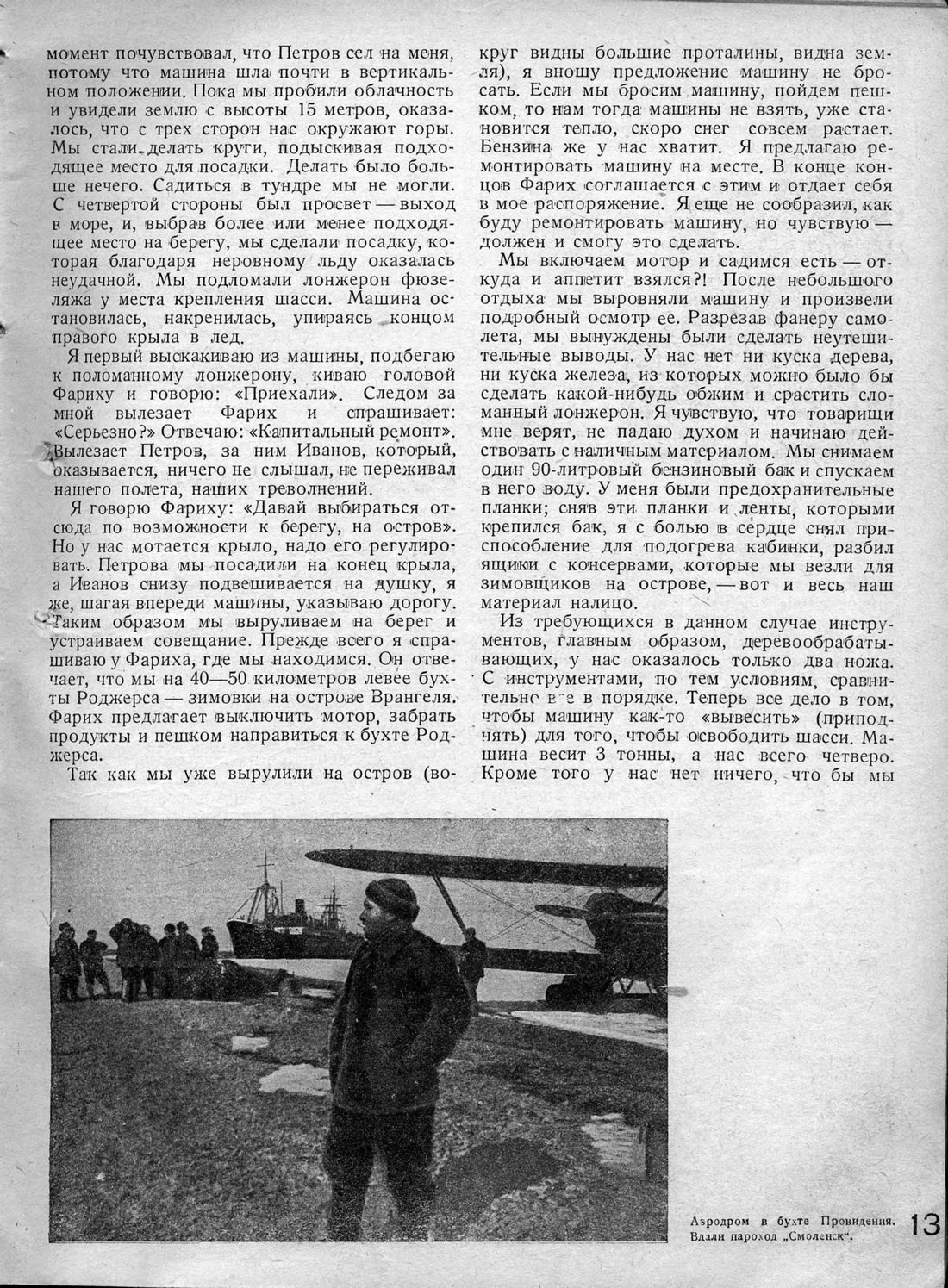 Я говорю Фариху: «Давай выбираться отсюда по возможности к берегу, на остров». Но у нас мотается крыло, надо его регулировать. Петрова мы посадили на конец крыла, а Иванов снизу подвешивается на душку, я же, шагая впереди машины, указываю дорогу. -Таким образом мы выруливаем на берег и устраиваем совещание. Прежде всего я спрашиваю у Фариха, где мы находимся. Он отвечает, что мы на 40—50 километров левее бухты Роджерса — зимовки на острове Врангеля. Фарих предлагает выключить мотор, забрать продукты и пешком направиться к бухте Роджерса.
