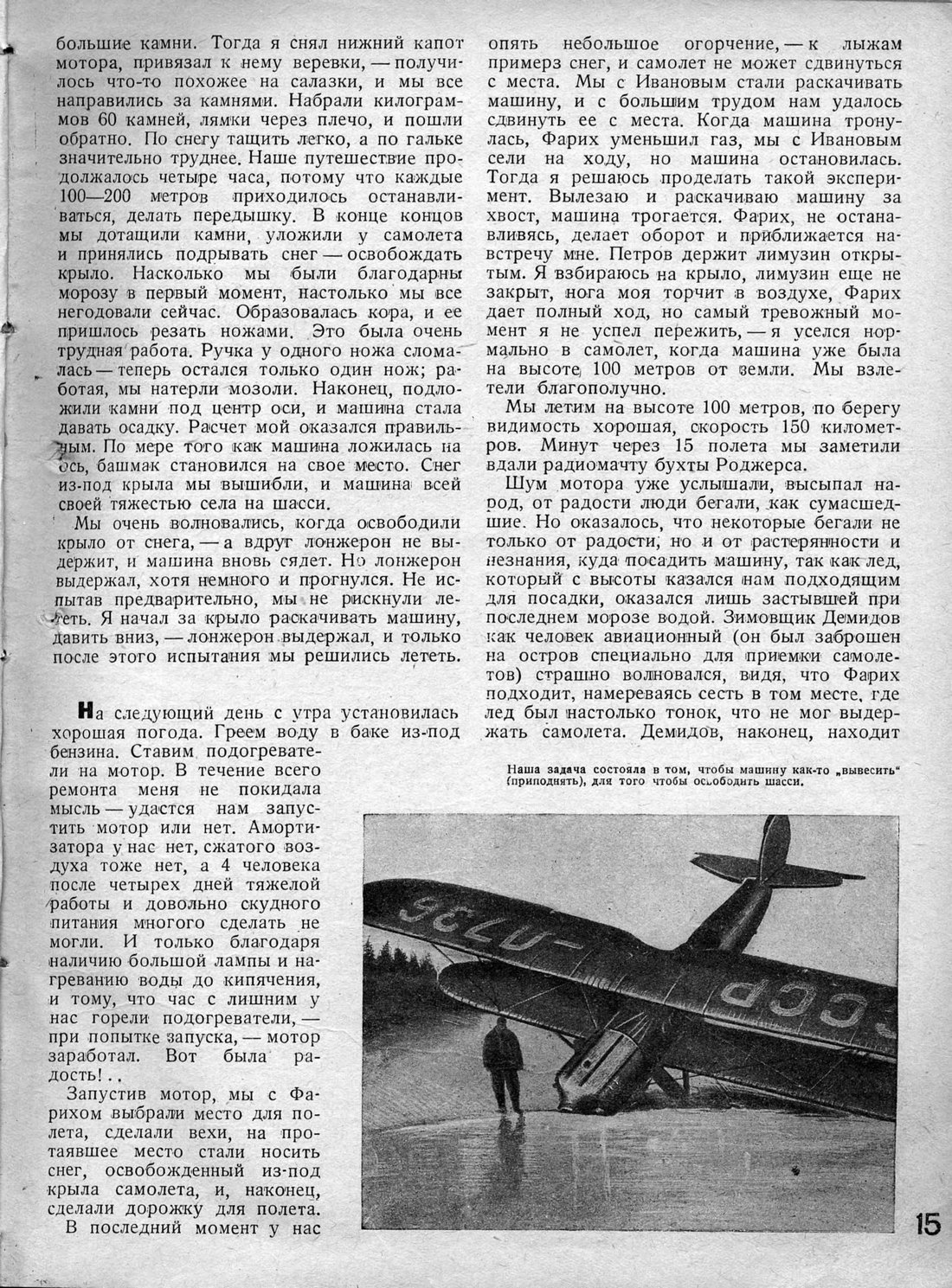 В последний момент у нас опять небольшое огорчение, — к лыжам примерз снег, и самолет не может сдвинуться с места. Мы с Ивановым стали раскачивать машину, и с большим трудом нам удалось сдвинуть ее с места. Когда машина тронулась, Фарих уменьшил газ, мы с Ивановым сели на ходу, но машина остановилась. Тогда я решаюсь проделать такой эксперимент. Вылезаю и раскачиваю машину за хвост, машина трогается. Фарих, не останавливясь, делает оборот и приближается навстречу мне. Петров держит лимузин открытым. Я взбираюсь на крыло, лимузин еще не закрыт, нога моя торчит в воздухе, Фарих дает полный ход, но самый тревожный момент я не успел пережить, — я уселся нормально в самолет, когда машина уже была на высоте 100 метров от земли. Мы взлетели благополучно.