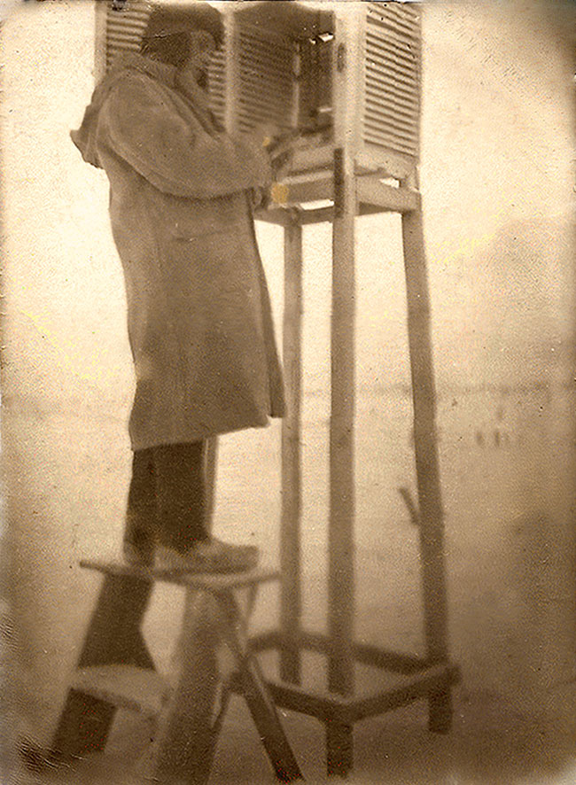 Началась поистине ударная работа. Все получили задание соответственно специальности. Совместно с геофизиком я приступил к оборудованию метеорологической станции в том объеме, который будет выполнять в течение многих будущих лет. Установили размер площадки, на которой будут установлены приборы. Столб длиной девять метров мы нашли в одном километре от станции и по воде доставили на площадку. С помощью рабочих быстро установили этот столб, в вершину которого был установлен флюгер (1). Затем установили дождемер и подставку для гелиографа.(2)
