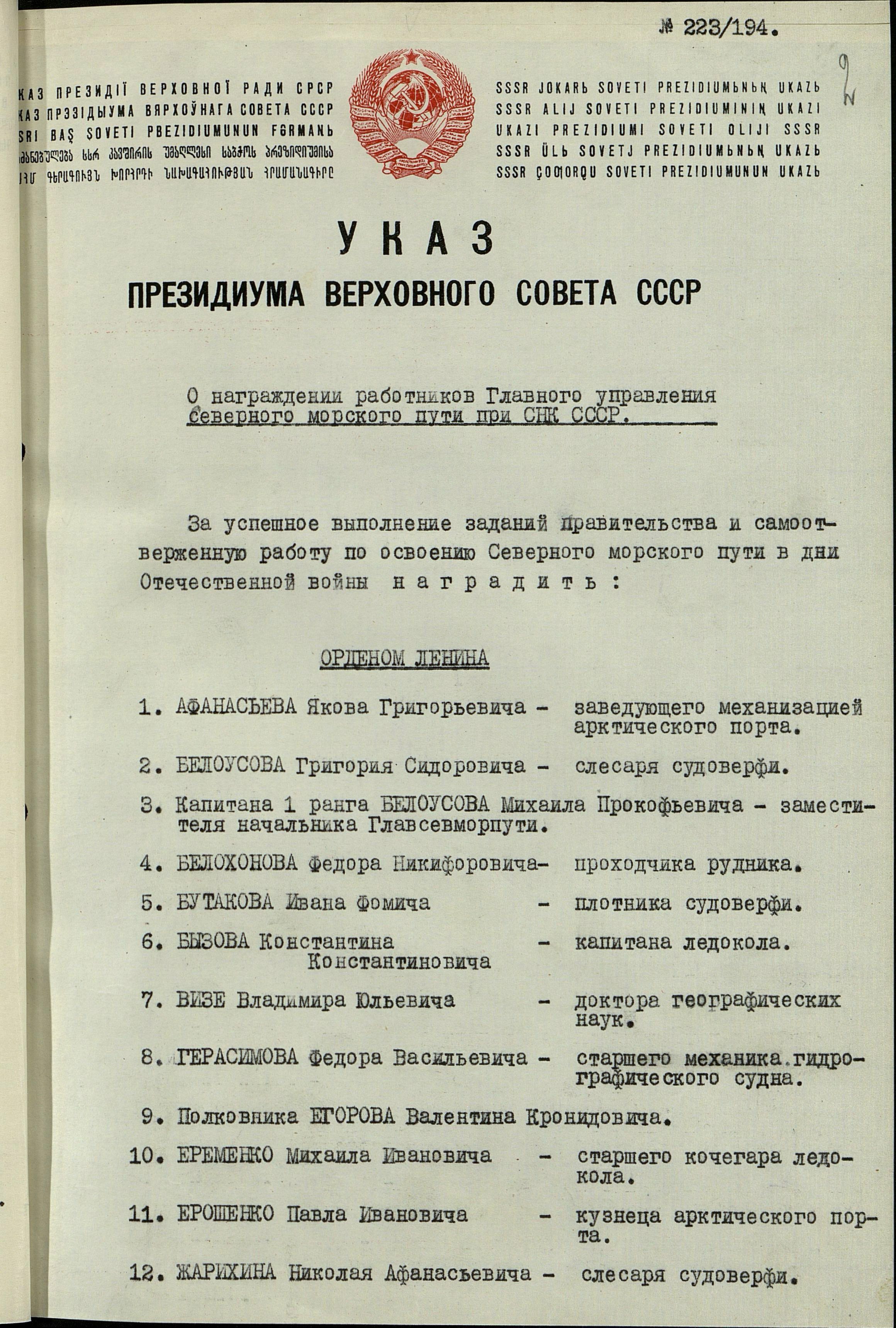 Указ Президиума Верховного Совета № 223/194 от 02.12.1945
