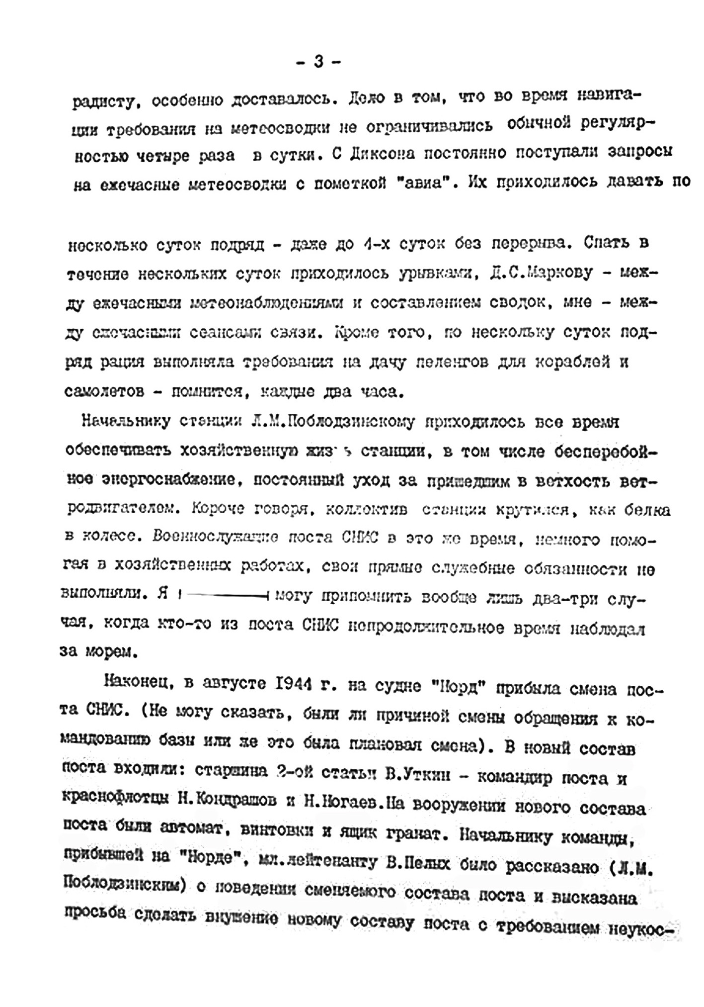 (часть строки вымарана) поста СНИС (службы наблюдения и связи) Карской военно-морской базы, располагавшейся на м.Стерлигова и преступно проспавшего (буквально!) высадку фашистского десанта; безосновательно возлагается вина на сотрудников Главсевморпути.