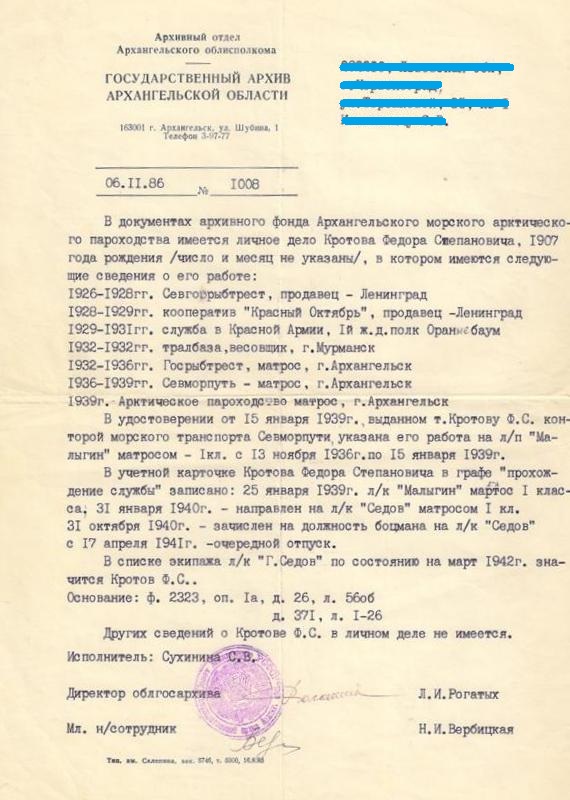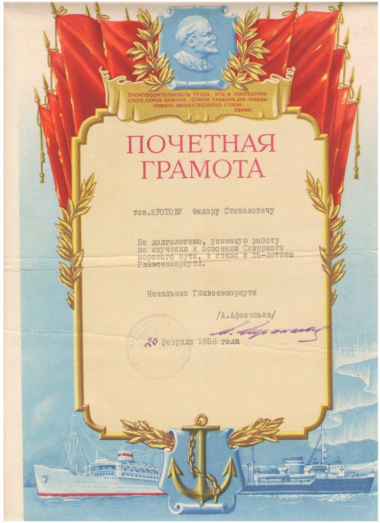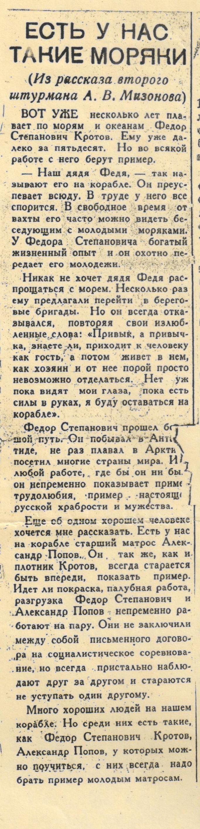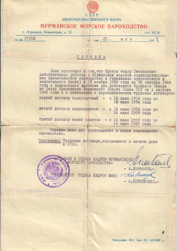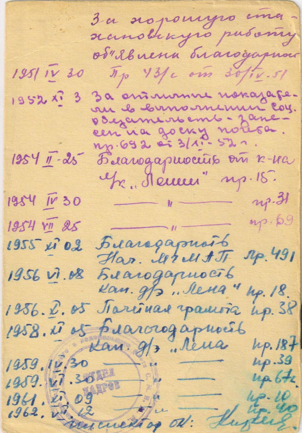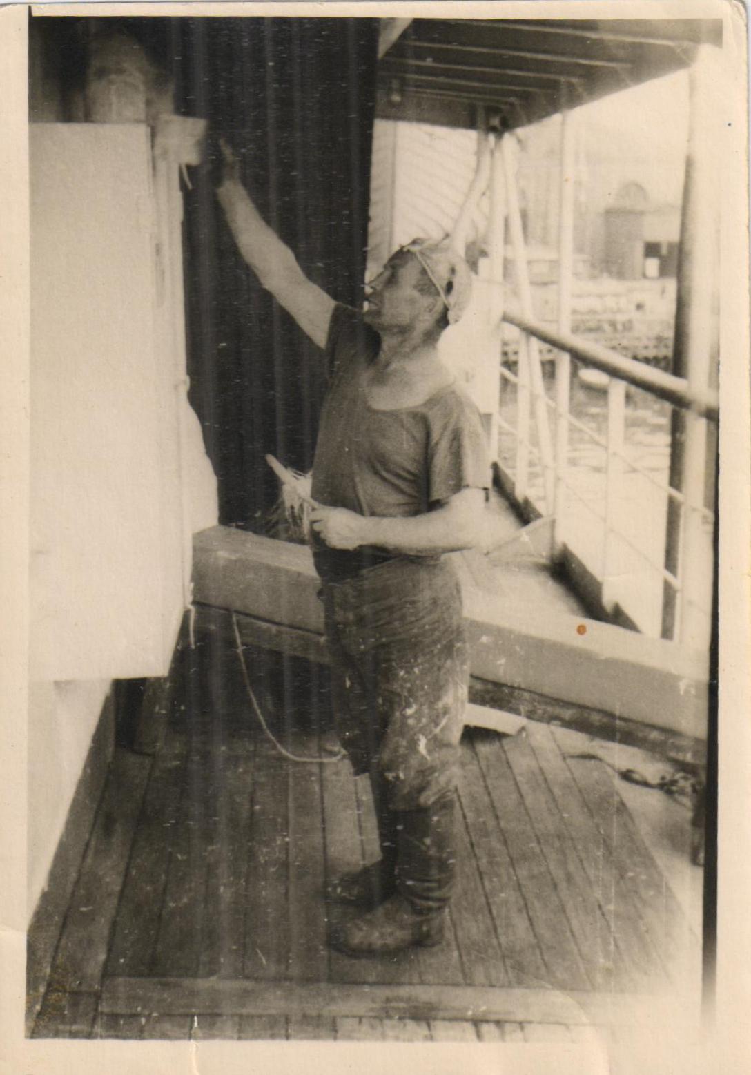 Большую часть своей жизни он посвятил работе на судах. В его послужном списке значится л/п "Малыгин", л/п "Седов", лед."Сталин", пар. "Сухуми", пар. "Пинега", лед. "Дежнёв", лед. "Ленин", д/э "Лена", лед. "Мелехов", теп. "Днепродзержинск".