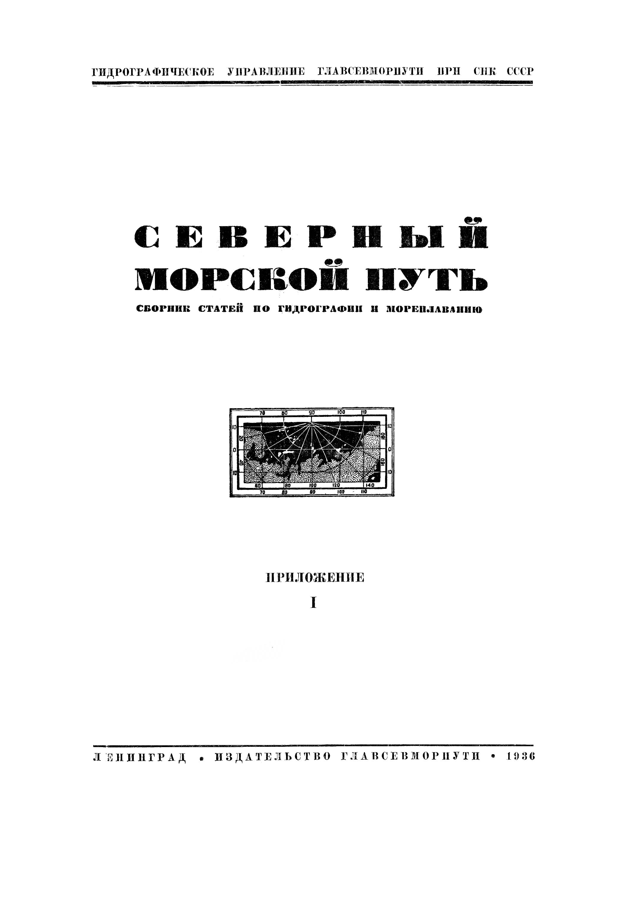 "Северный морской путь. Сборник статей по гидрографии и мореплаванию" Приложение I. Л., Изд-во Главсевморпути, 1936. 26 с., илл., карт.